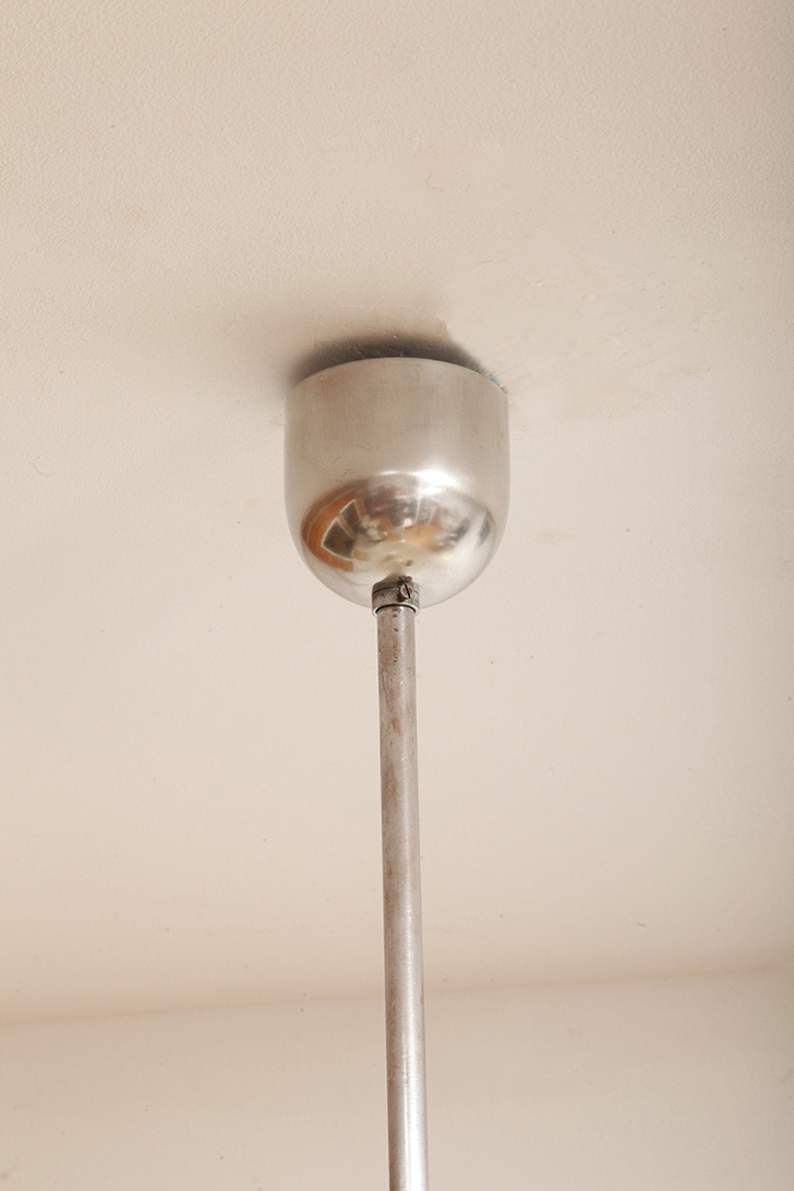 Jedyne ślady wieku można zauważyć na metalowej sztycy, podsufitce i nakrętce zamykającej bryłę lampy od dołu (zdjęcia). Nic spektakularnego. Drobne rysy i lekkie punktowe spatynowanie (odbarwienia) w metalu.