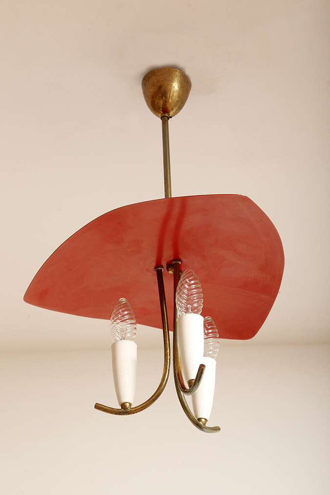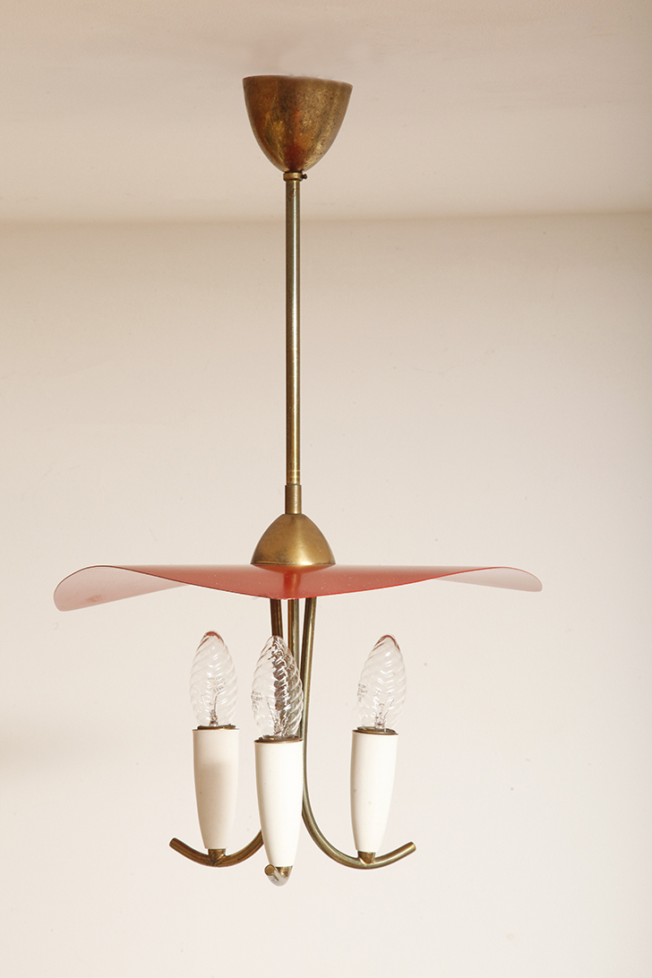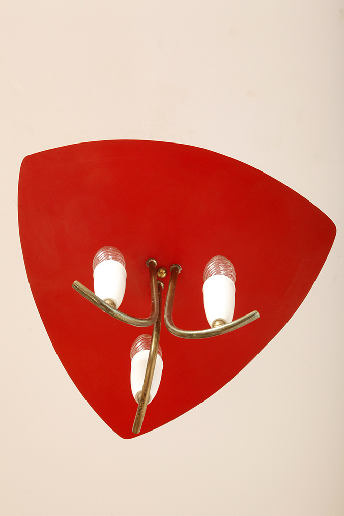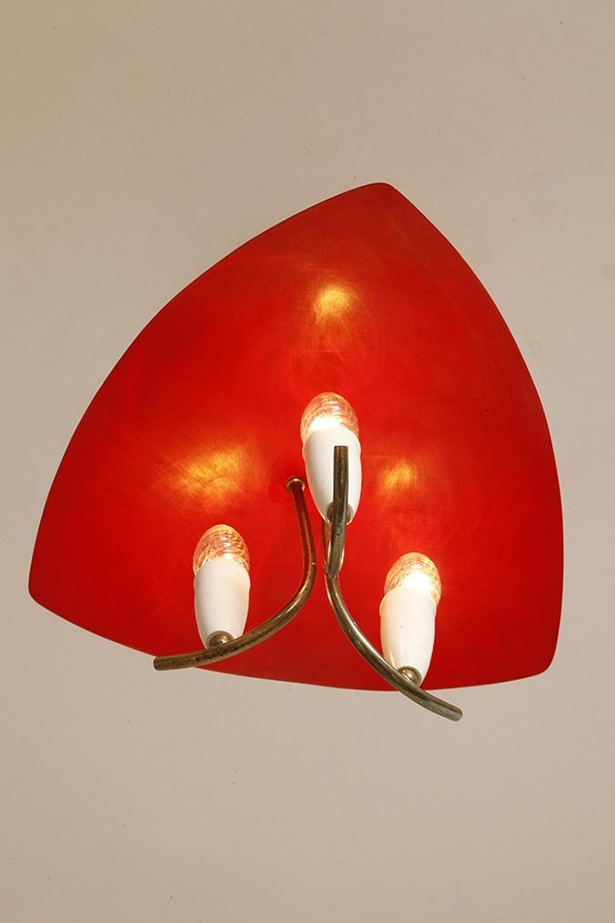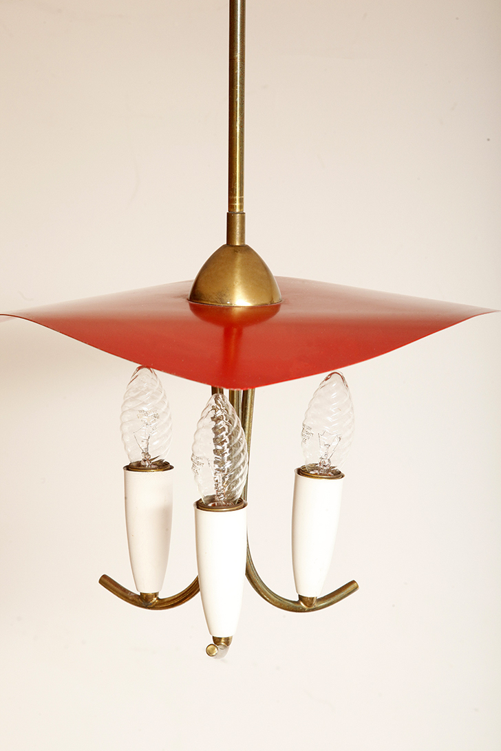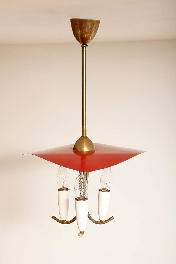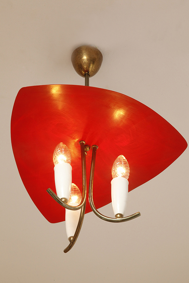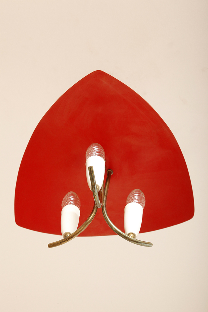 Nad nimi znajduje się trójkątny klosz z lakierowanego na czerwono metalu.
