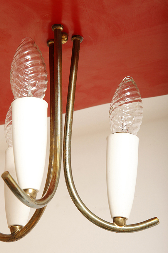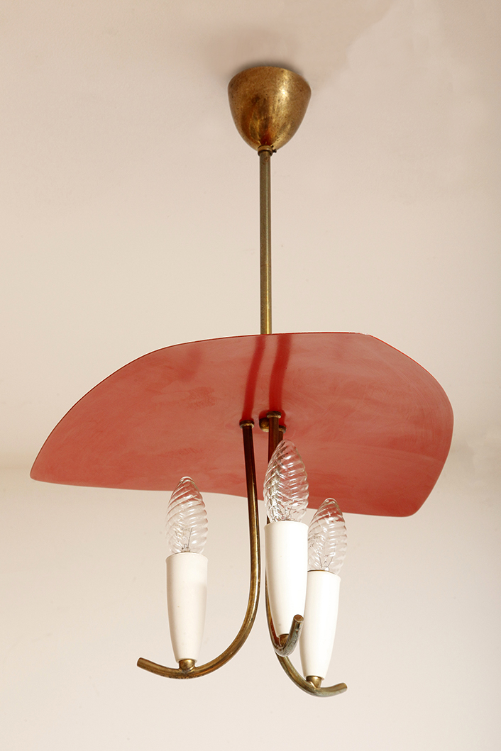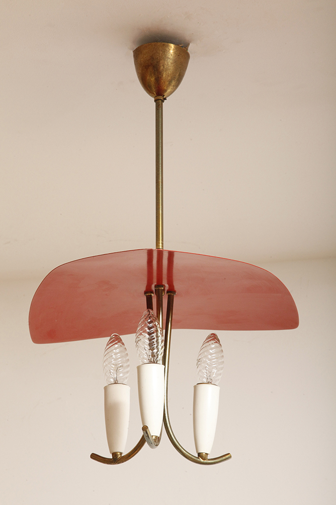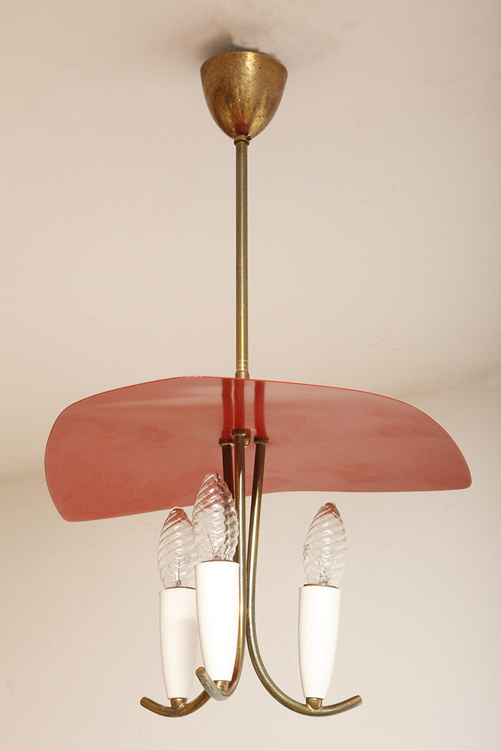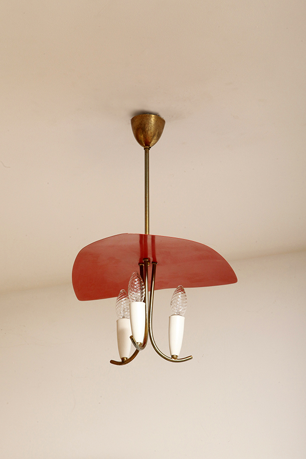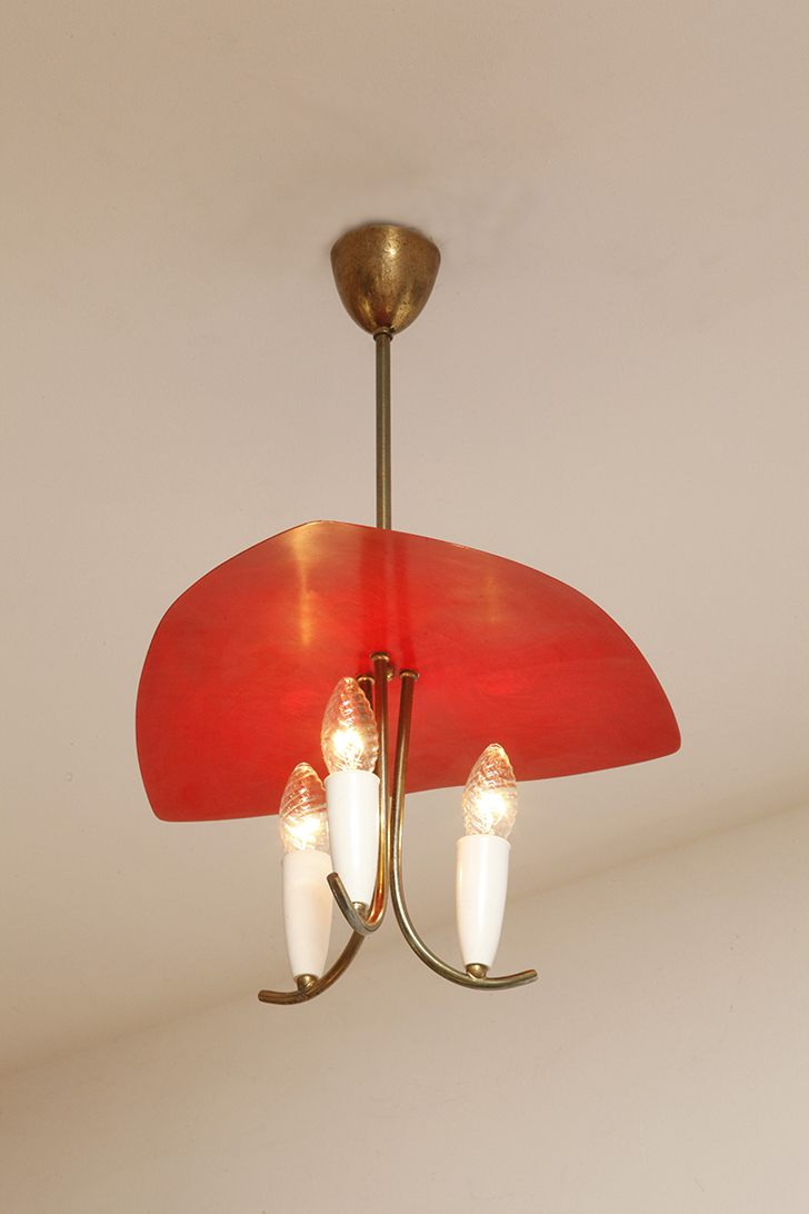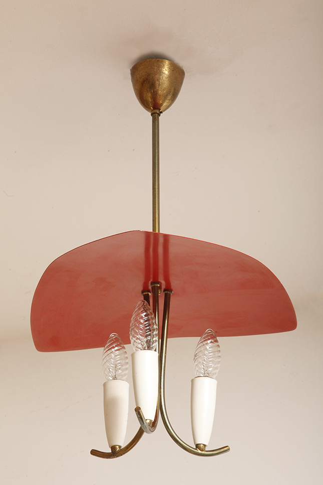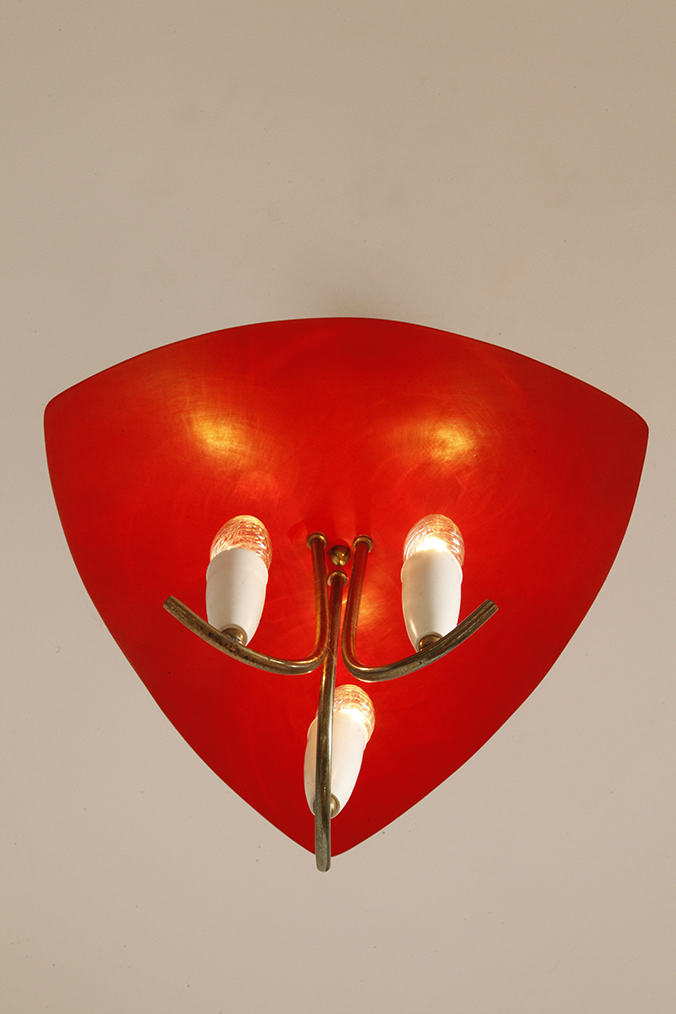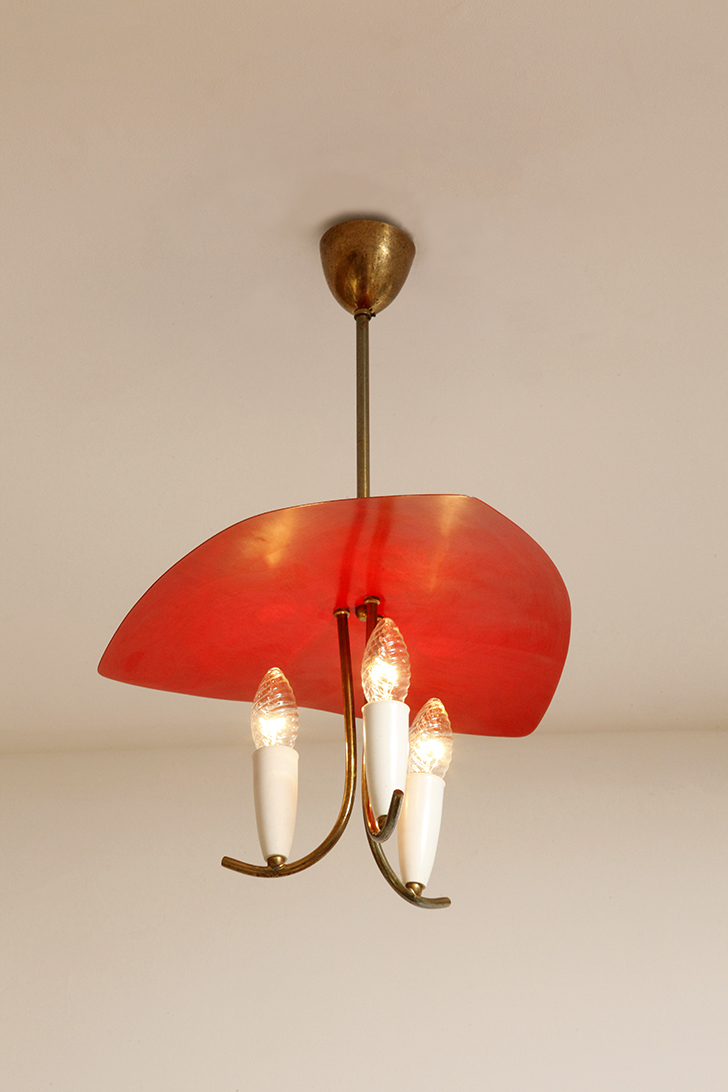 Nad nimi znajduje się trójkątny klosz z lakierowanego na czerwono metalu.