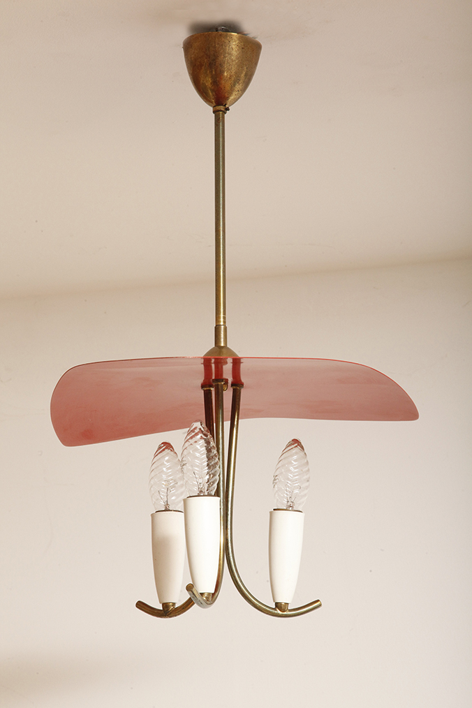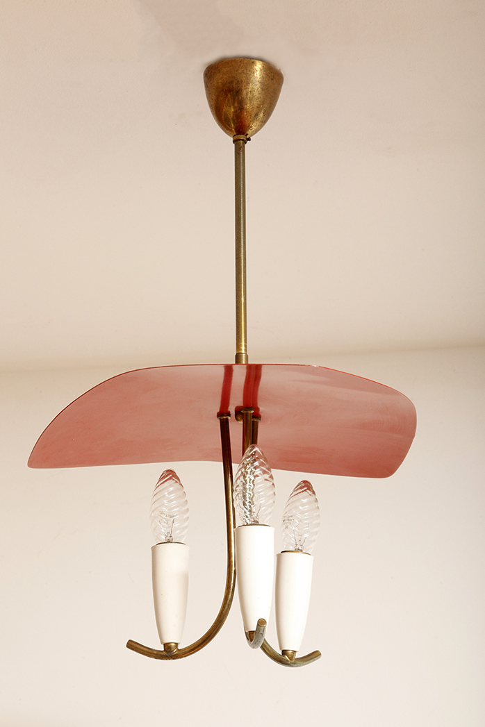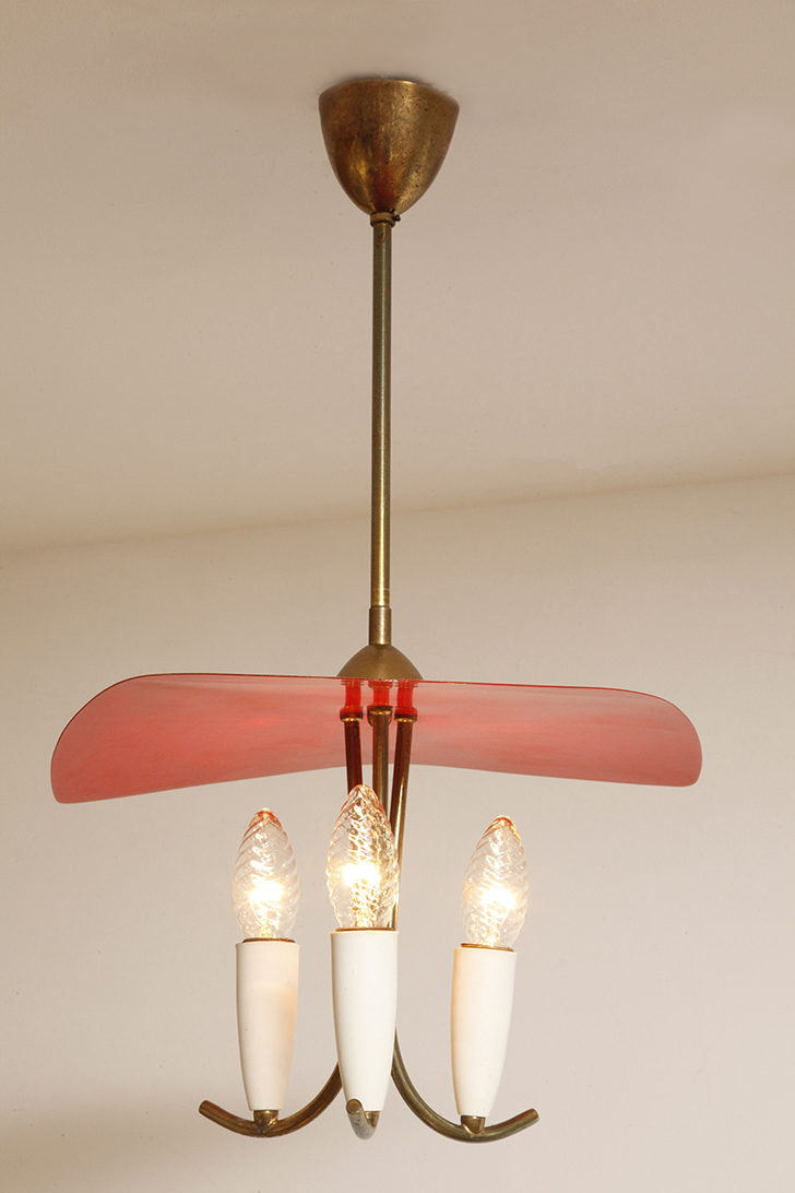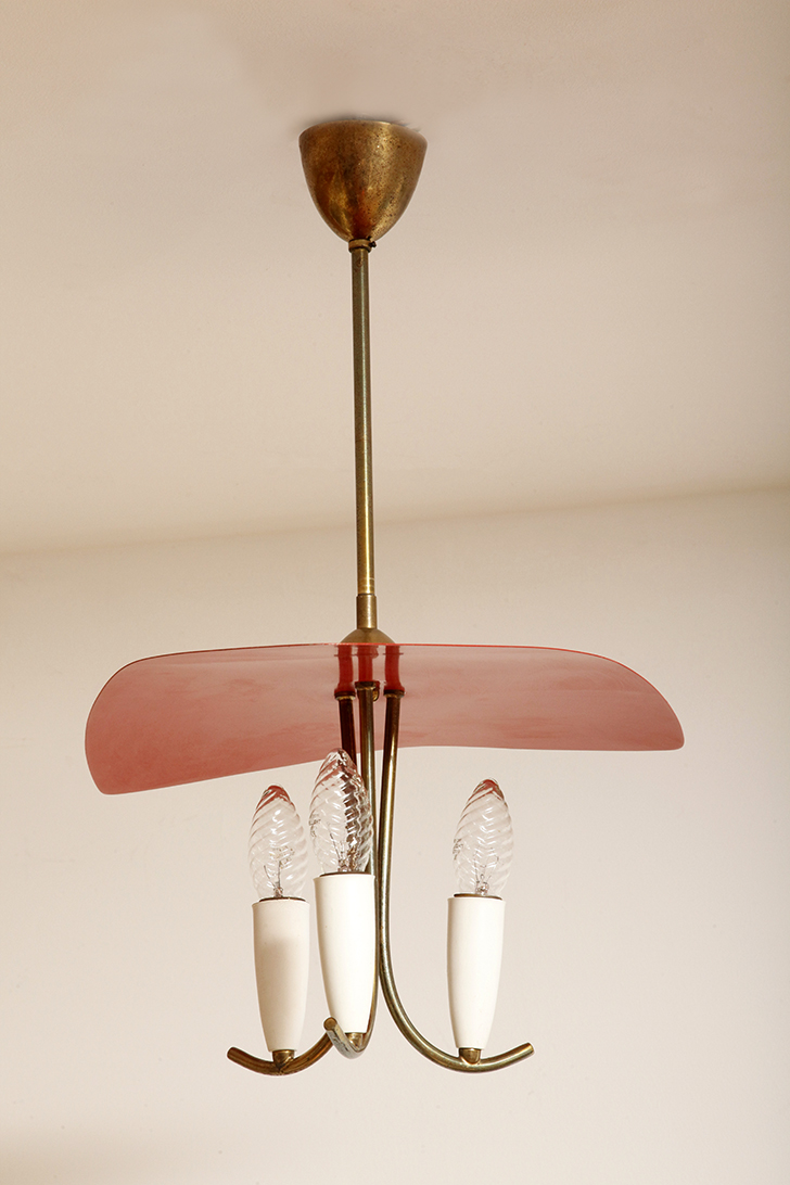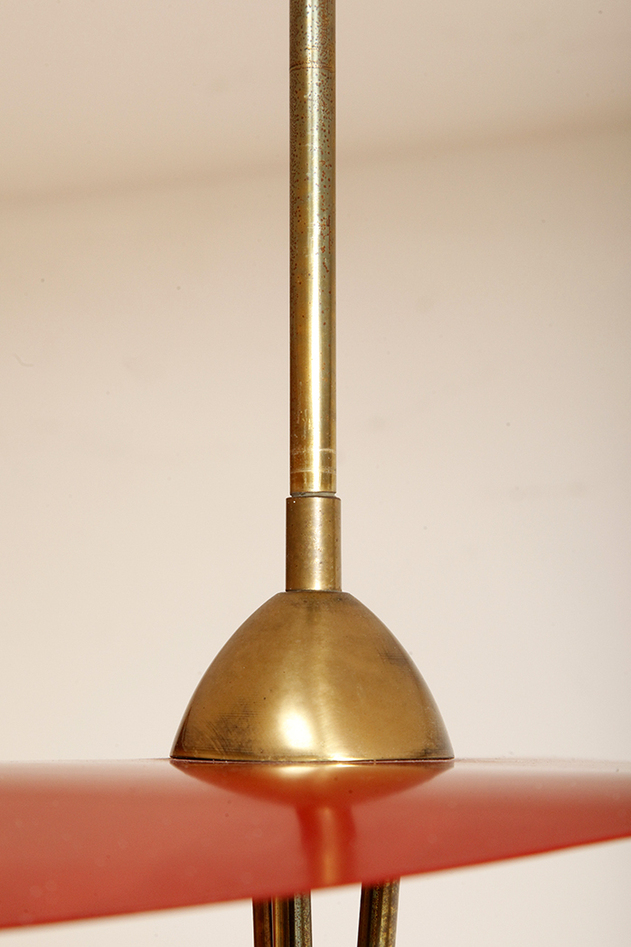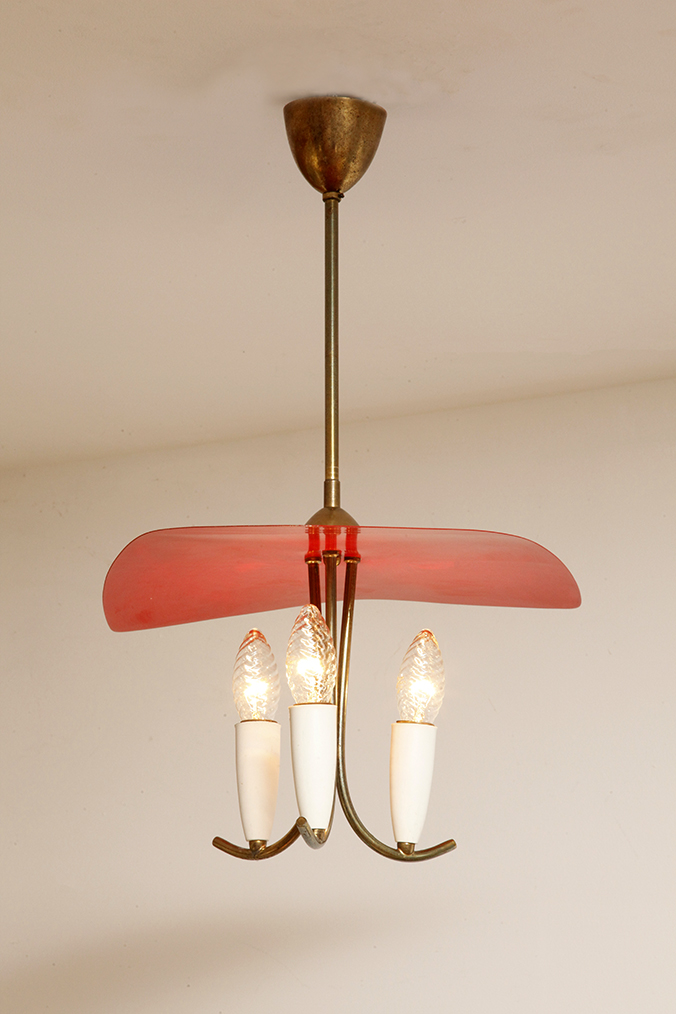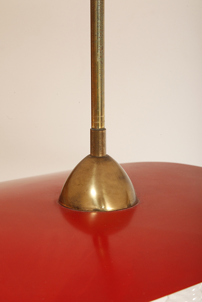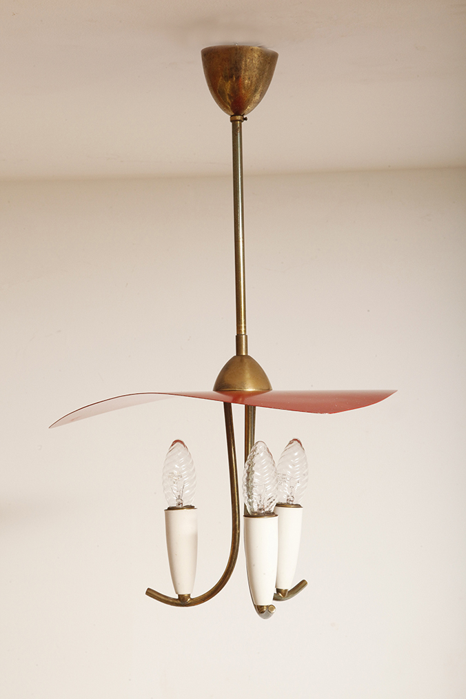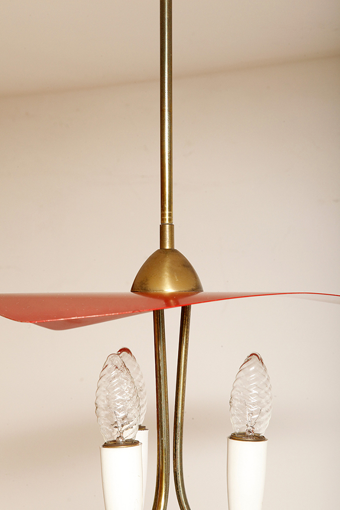 Nad nimi znajduje się trójkątny klosz z lakierowanego na czerwono metalu.