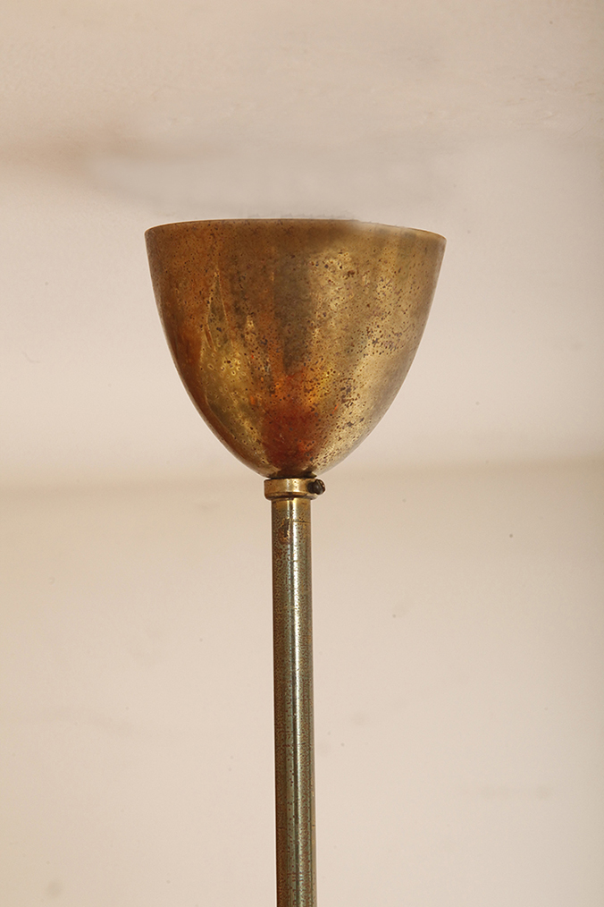 Lampa zachowana w dobrym stanie vintage. Złote rurki (takie bardziej stare złoto) z widocznym zębem czasu w postaci licznych śladów utlenienia (zdjęcia). W końcu to lampa vintage. Podobnie sprawy się mają z metalową podsufitką.