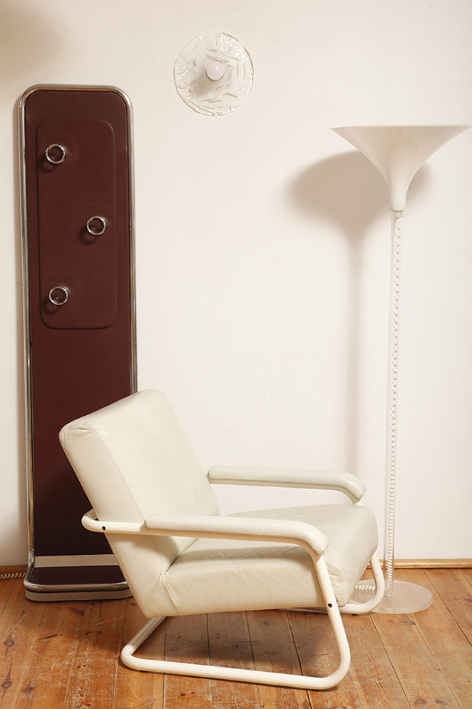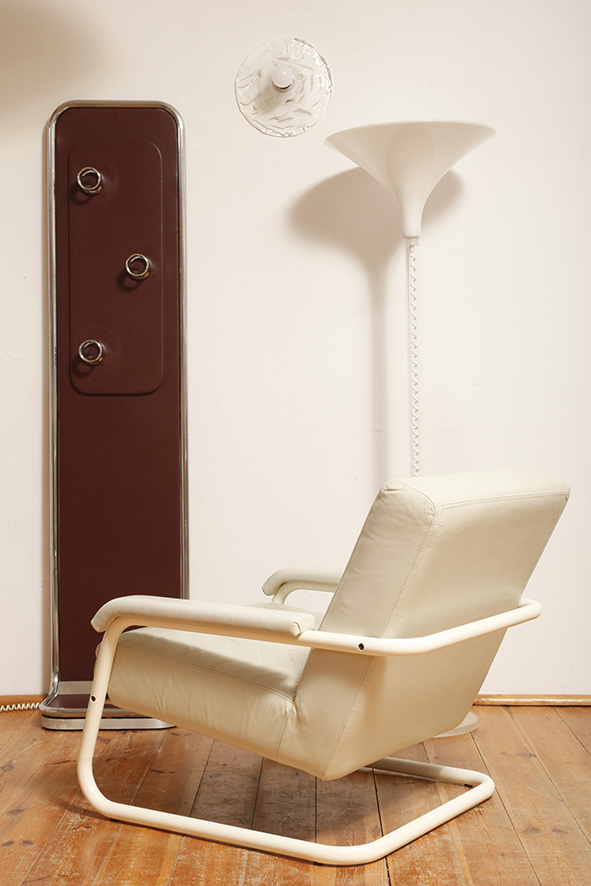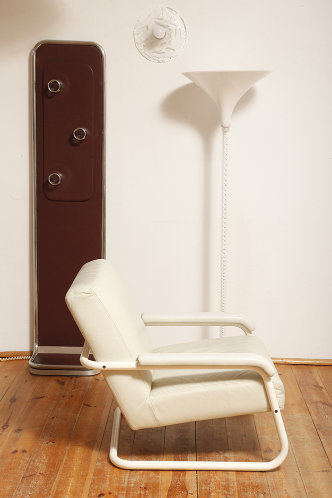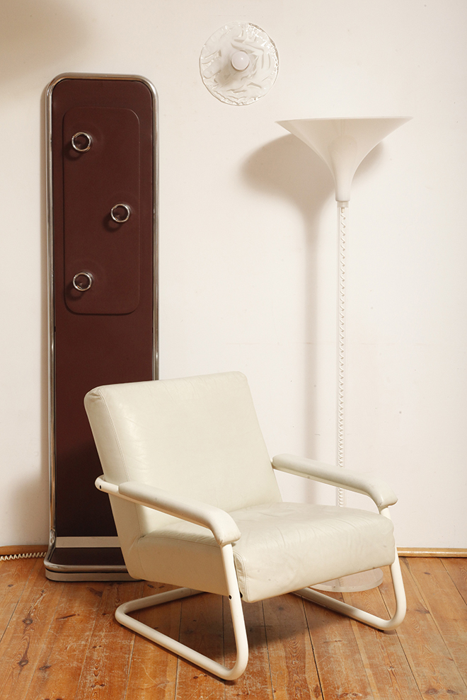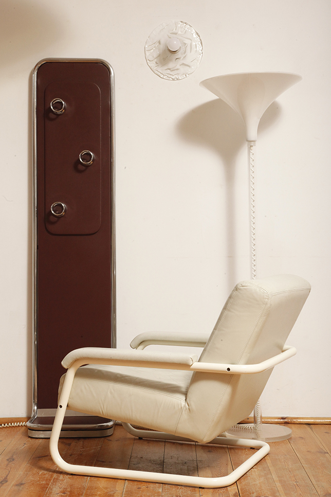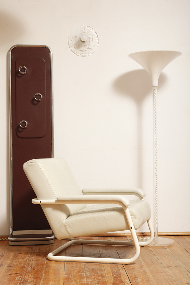 Konstrukcja z chromowanej metalowej rury (lekko spatynowanej, co dodaje wieszakowi autentyczności) z centralnym panelem drewnianym pokrytym imitacją skóry w kolorze burgundowym (w zależności od oświetlenia wydaje się śliwkowy, lub brązowy).