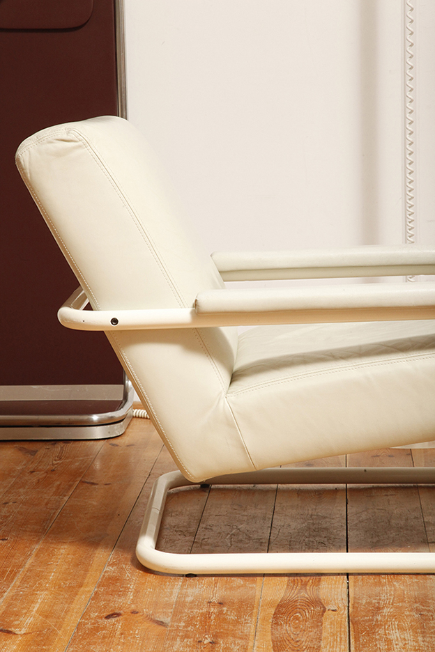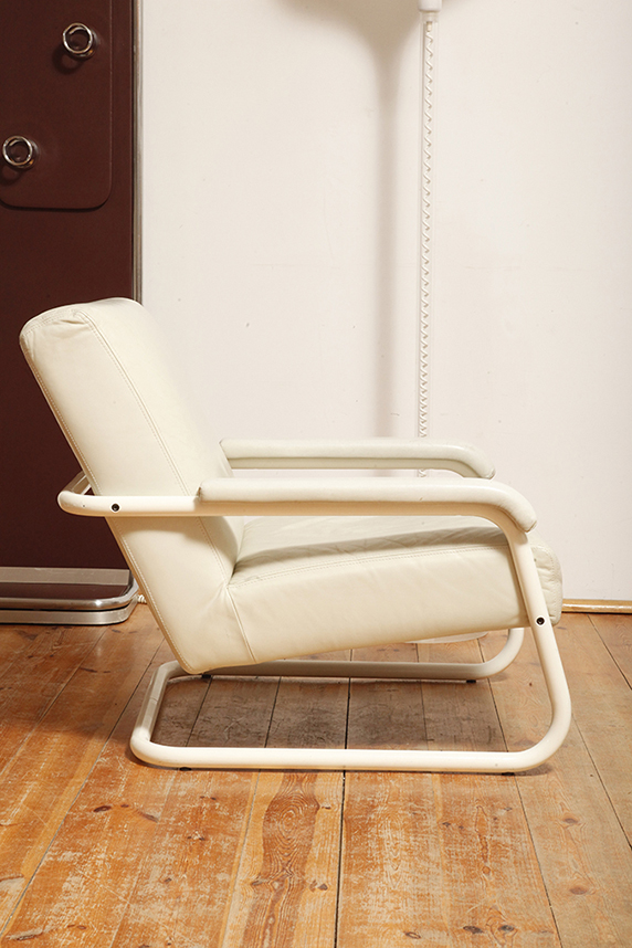 Zachowany w bardzo dobrym stanie vintage. Nie ma żadnych spektakularnych wad. Jedynie na umieszczonym nad podstawą metalowym panelu widać kilka rys użytkowych i obita skajem podstawa ma miejsca z drobnymi małymi białymi plamkami (zdjęcia). Trudno te mankamenty zauważyć w codziennym użytkowaniu.