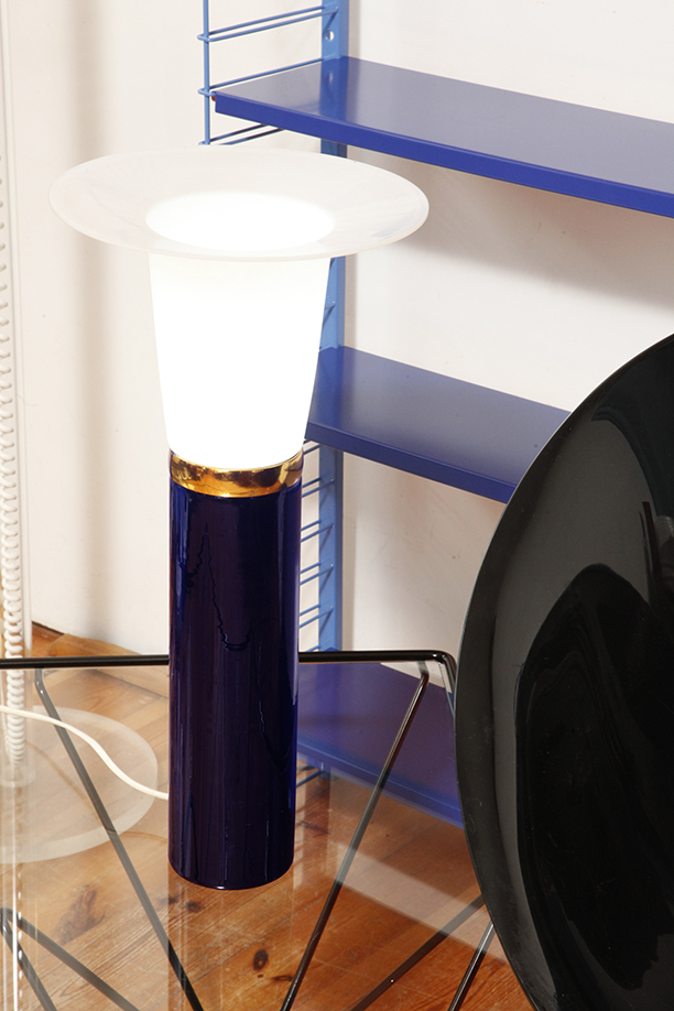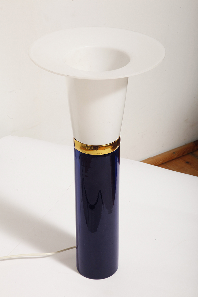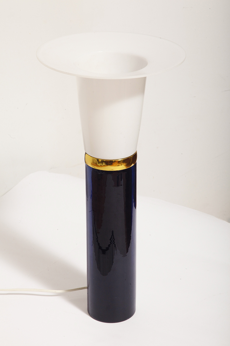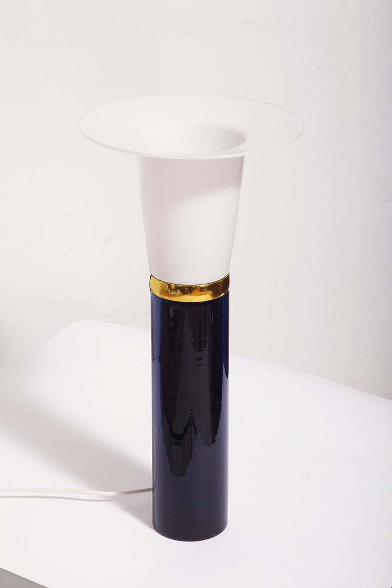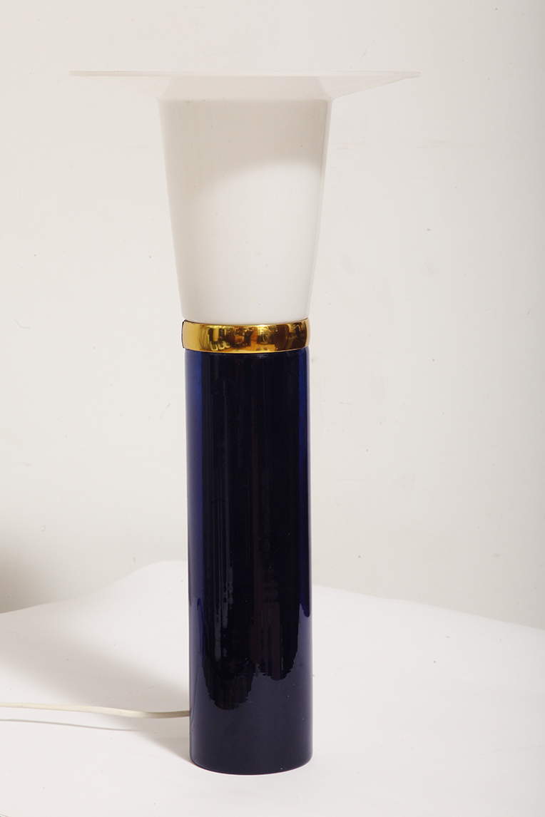 Ta elegancka lampa stołowa została zaprojektowana przez Uno i Östen Kristiansson dla firmy Luxus w Szwecji w latach 60/70. XX wieku. Walcowata podstawa w kształcie tuby wykonana z grubego ciemno granatowego szkła.