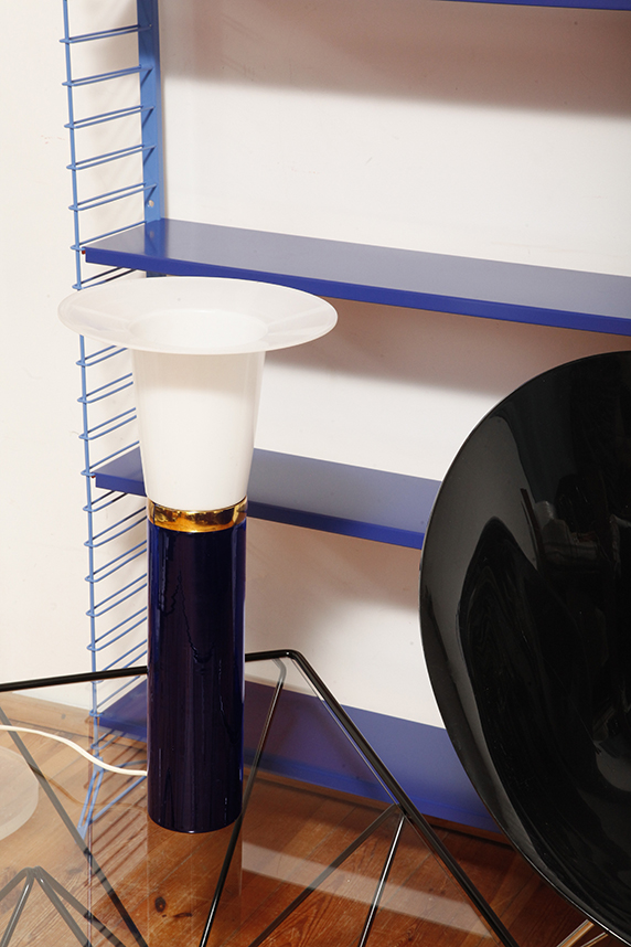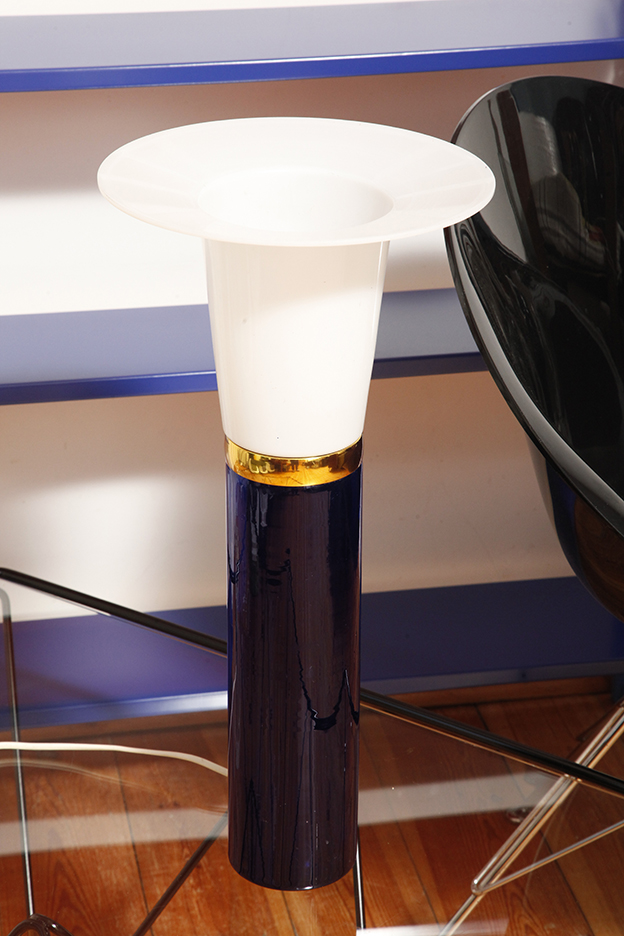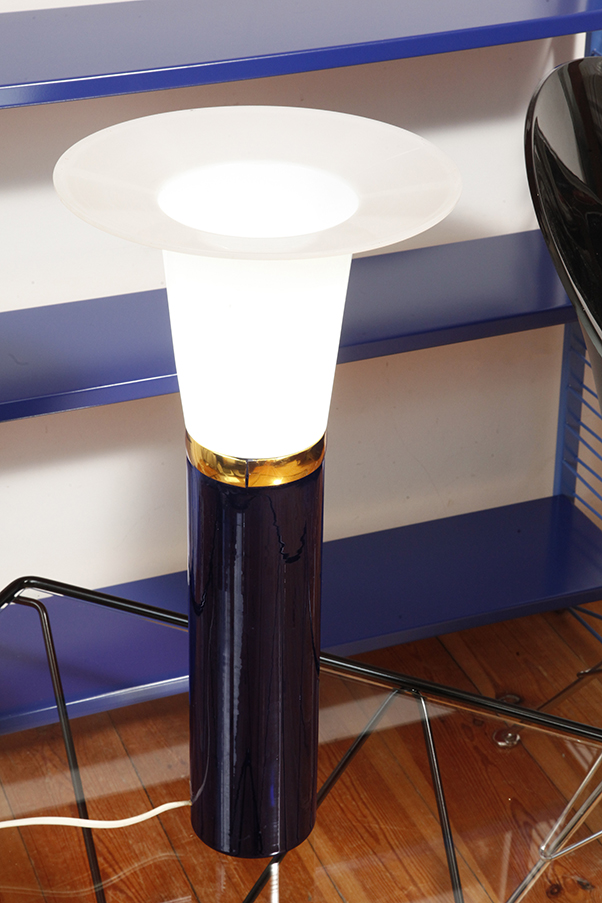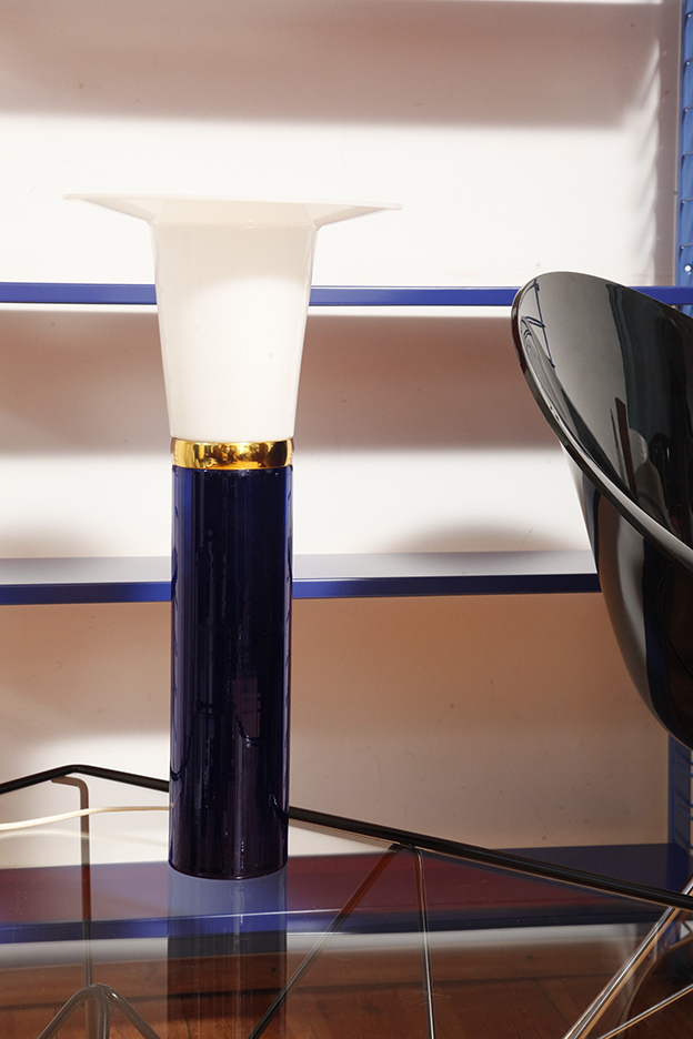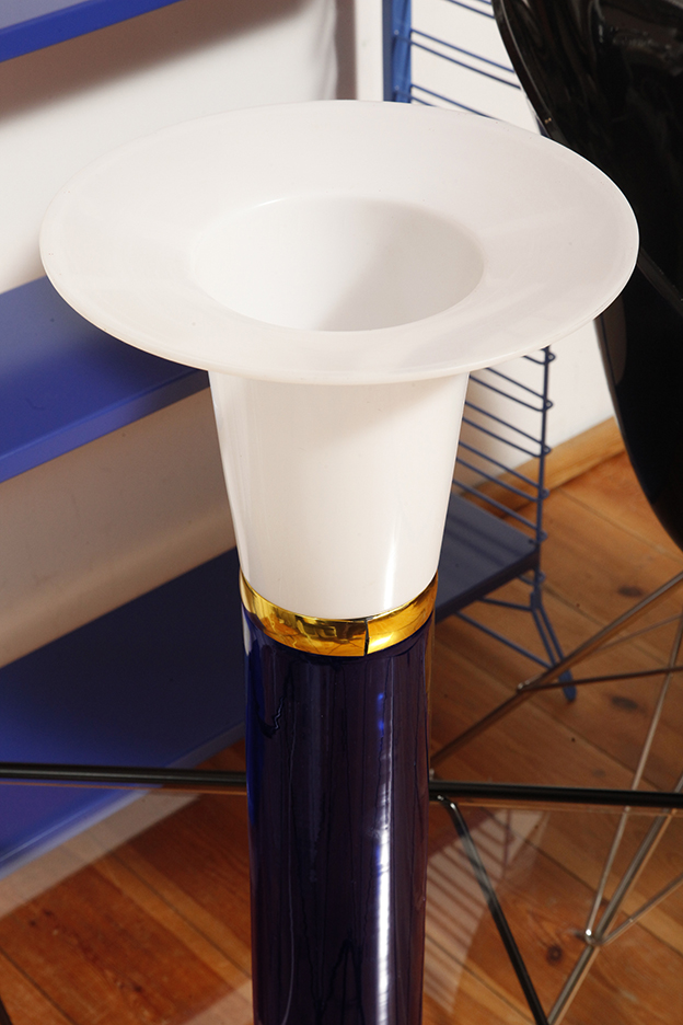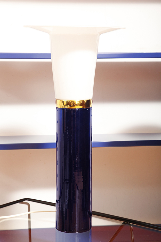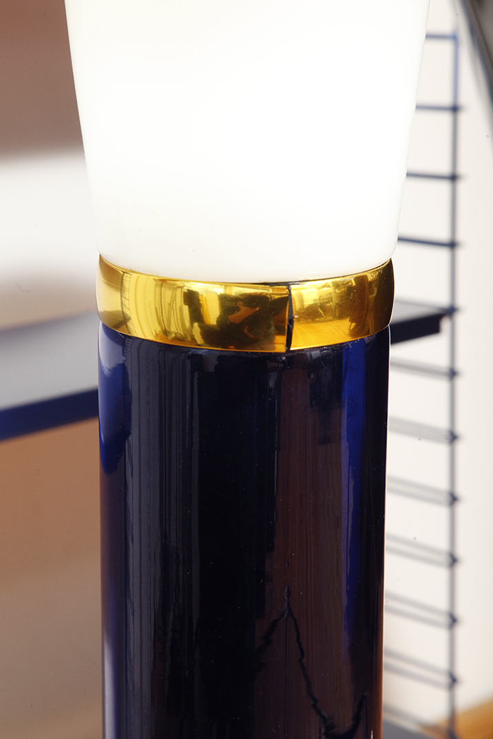 Ta elegancka lampa stołowa została zaprojektowana przez Uno i Östen Kristiansson dla firmy Luxus w Szwecji w latach 60/70. XX wieku. Walcowata podstawa w kształcie tuby wykonana z grubego ciemno granatowego szkła.