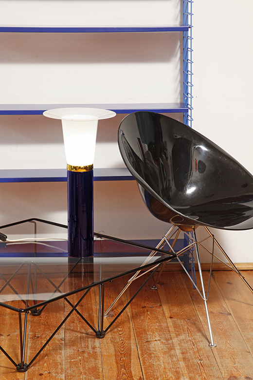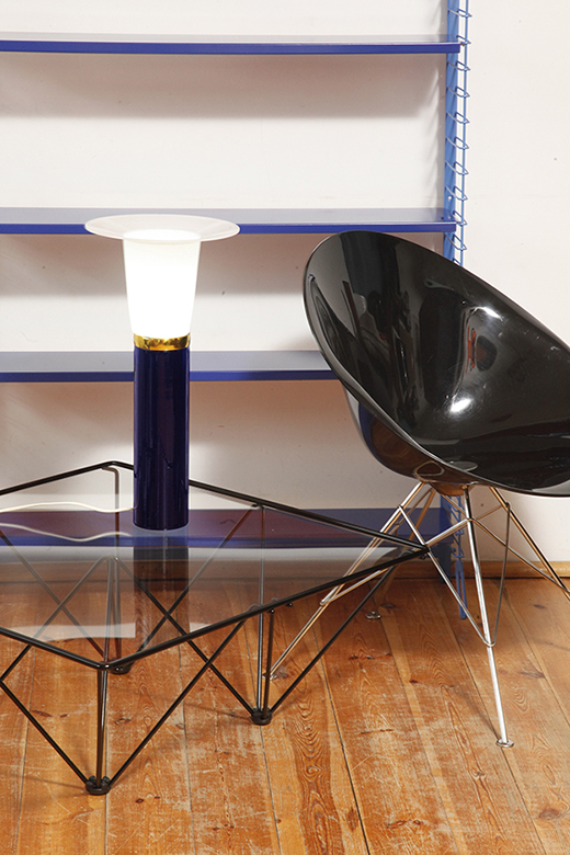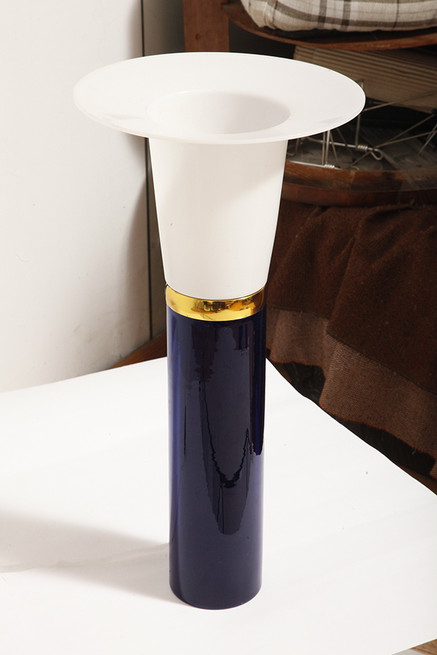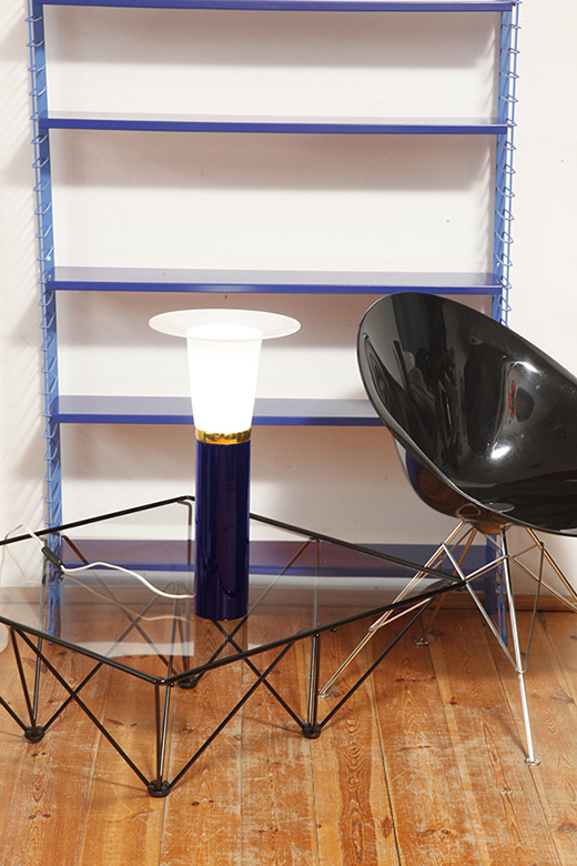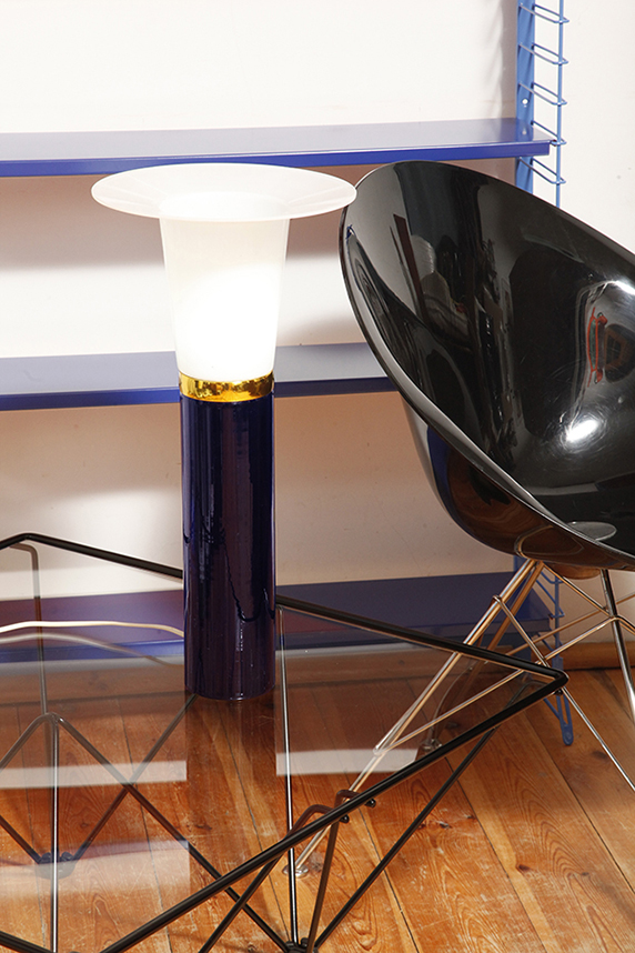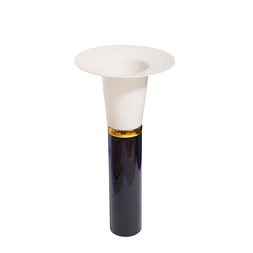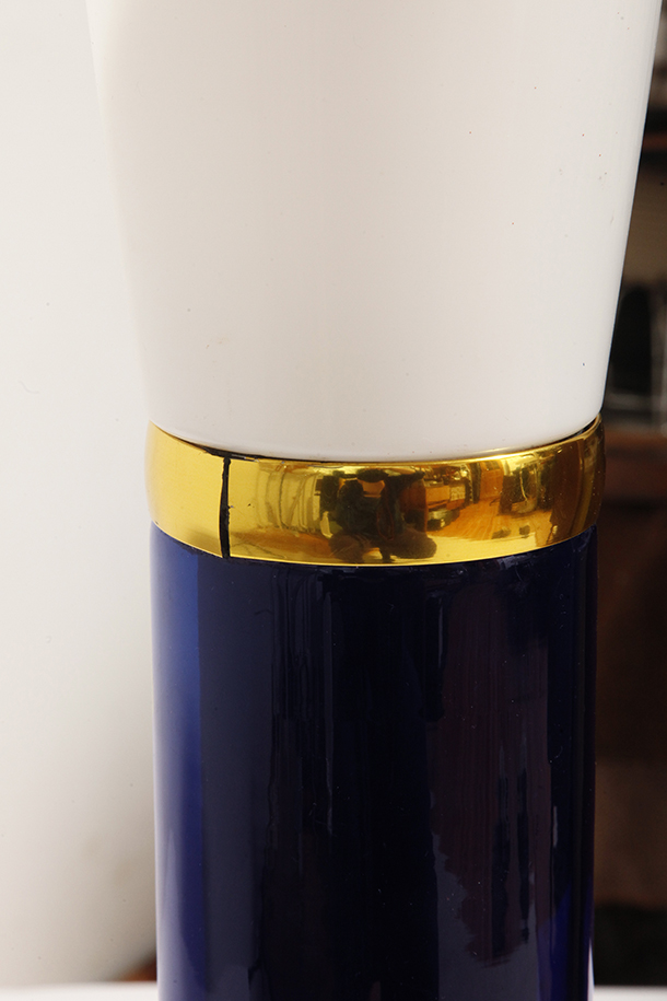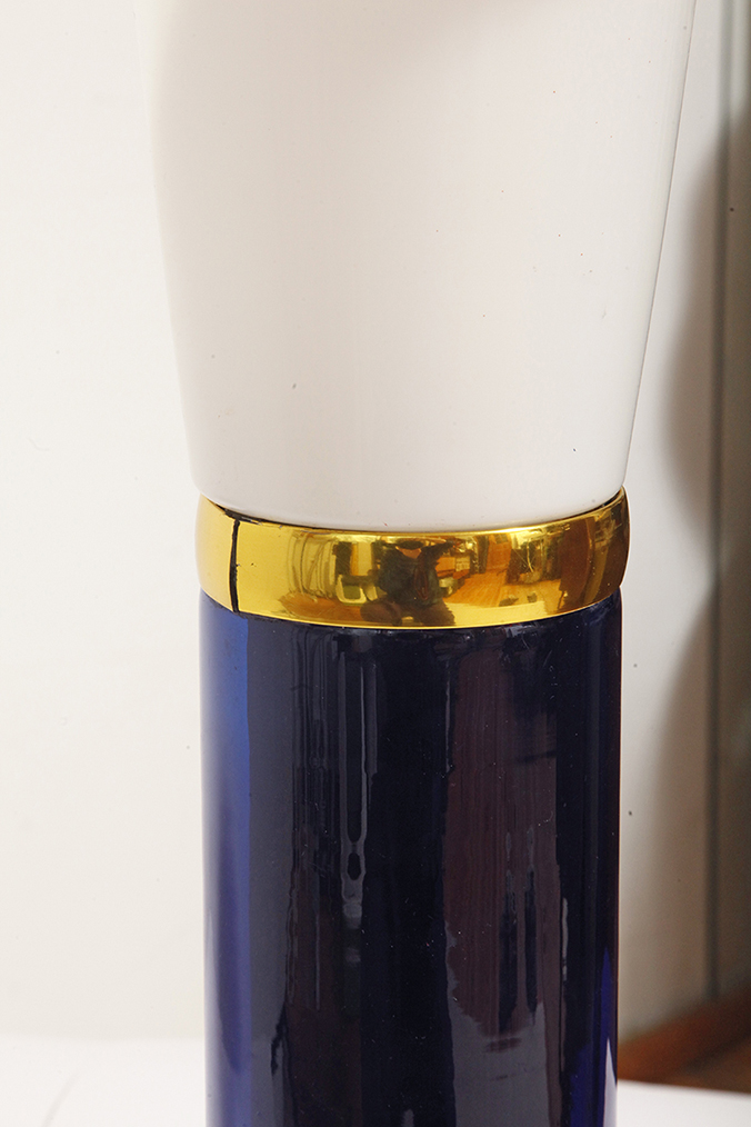 Ta elegancka lampa stołowa została zaprojektowana przez Uno i Östen Kristiansson dla firmy Luxus w Szwecji w latach 60/70. XX wieku. Walcowata podstawa w kształcie tuby wykonana z grubego ciemno granatowego szkła.