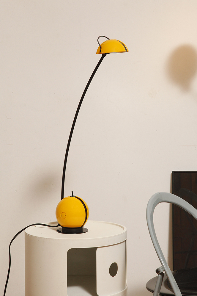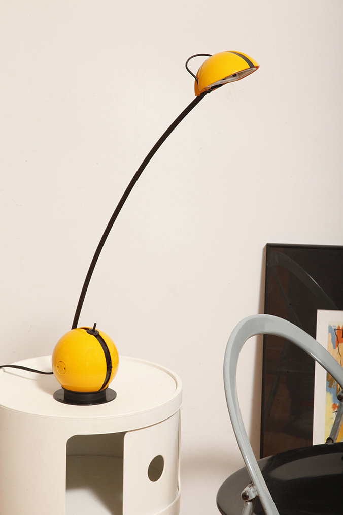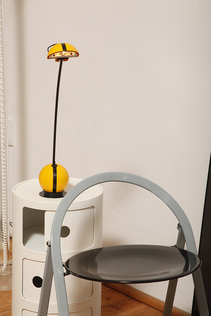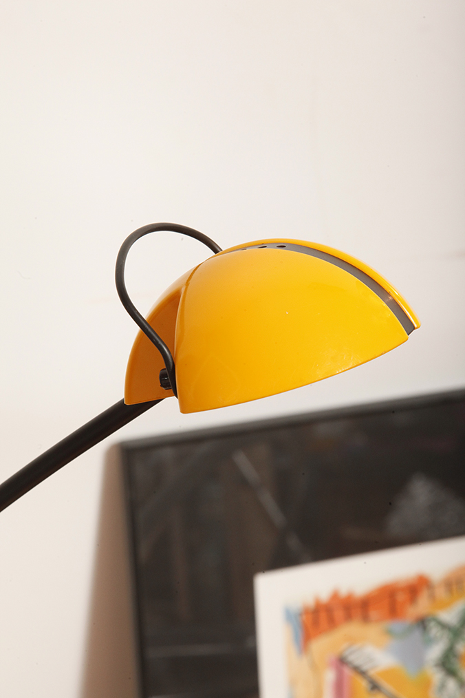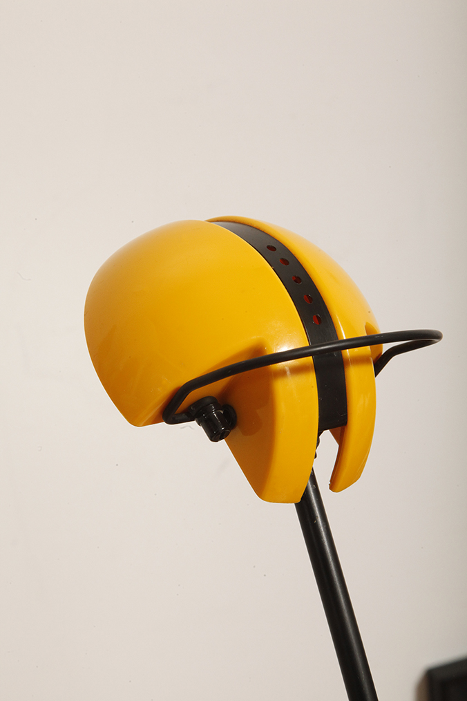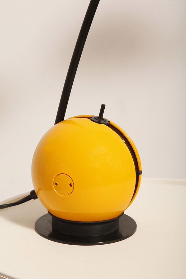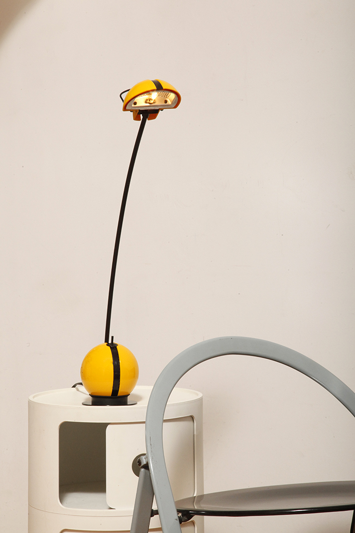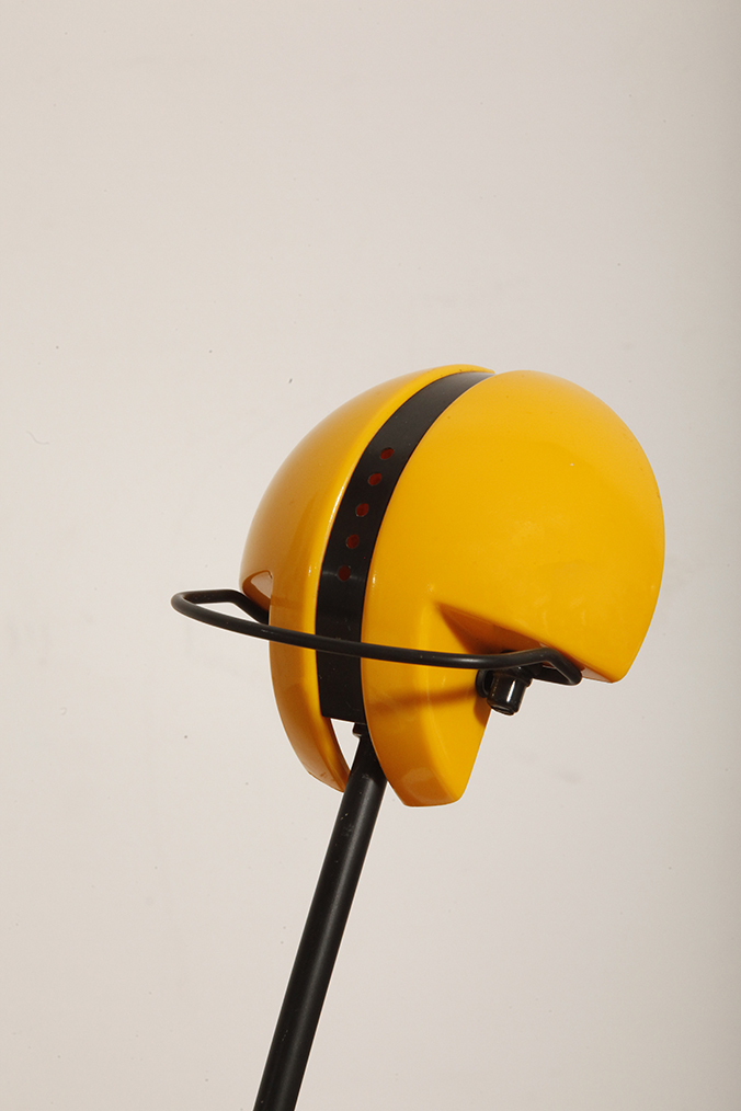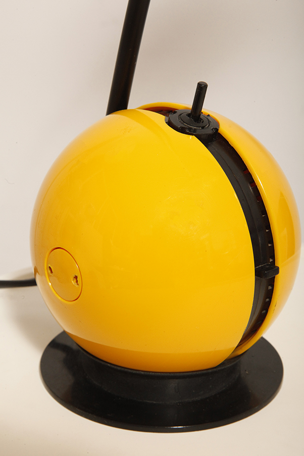 Cała żółta z czarnymi dodatkami, czyli bardzo klasycznie, choć lampa w ogóle klasyczna nie jest. Jak całe lata 80.