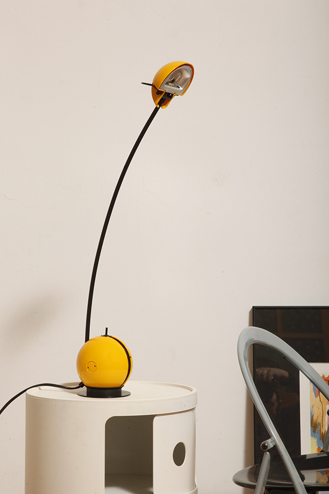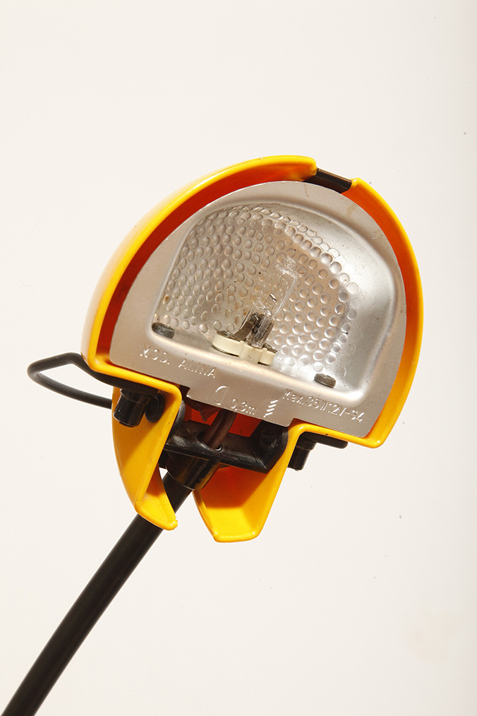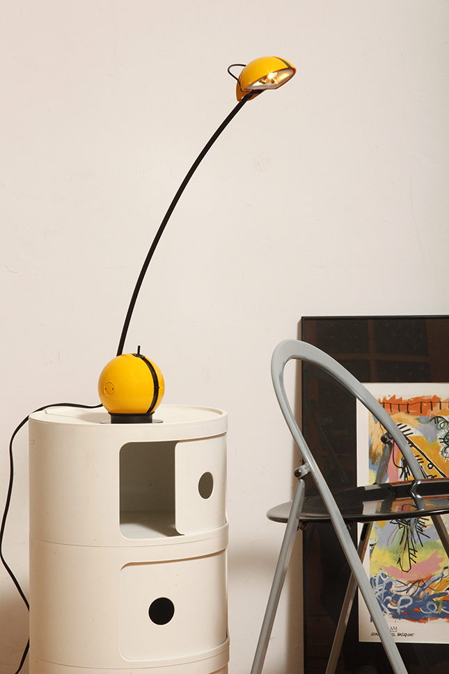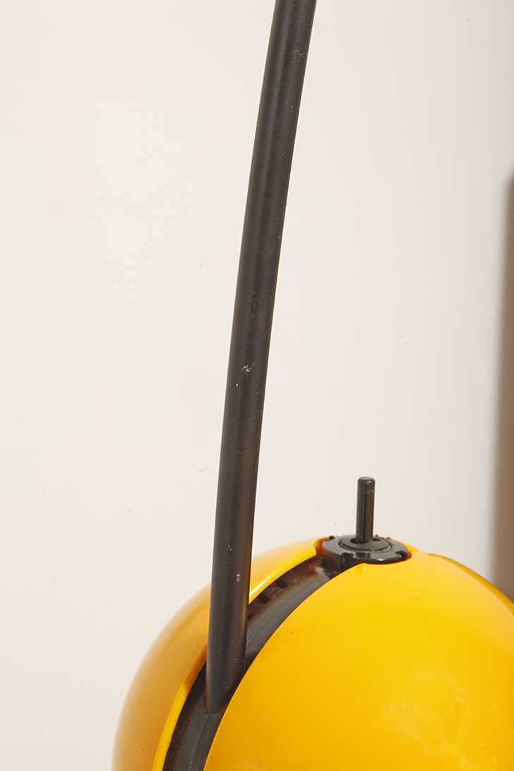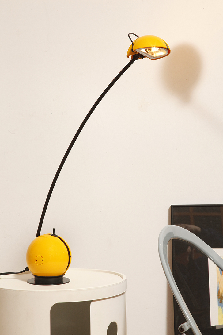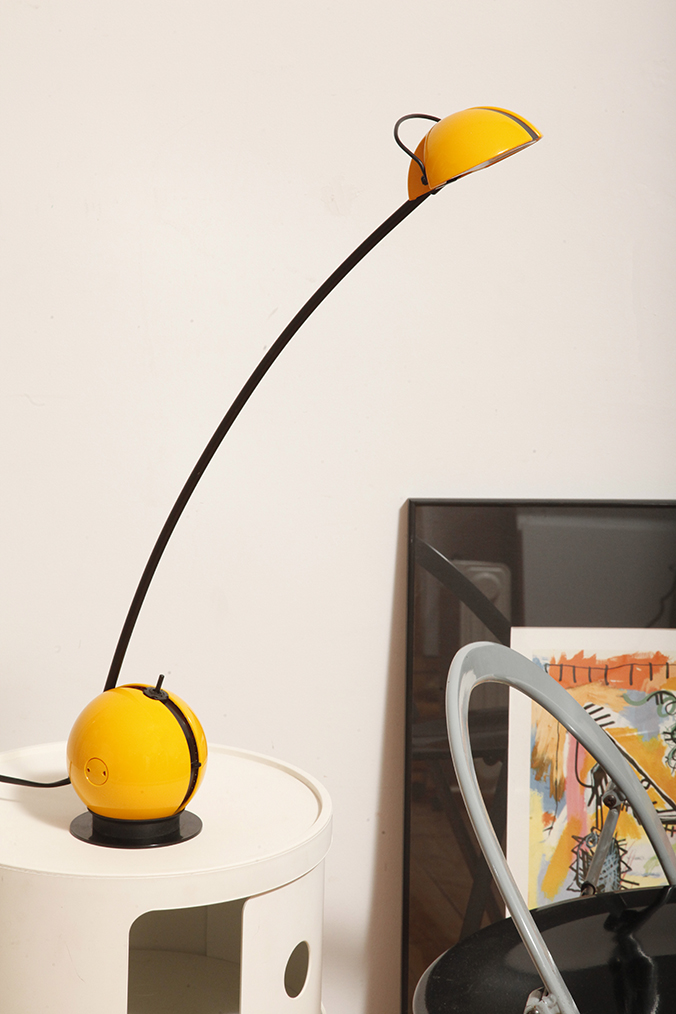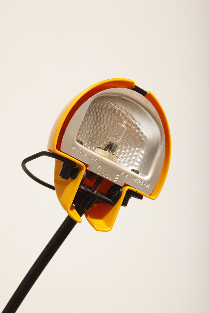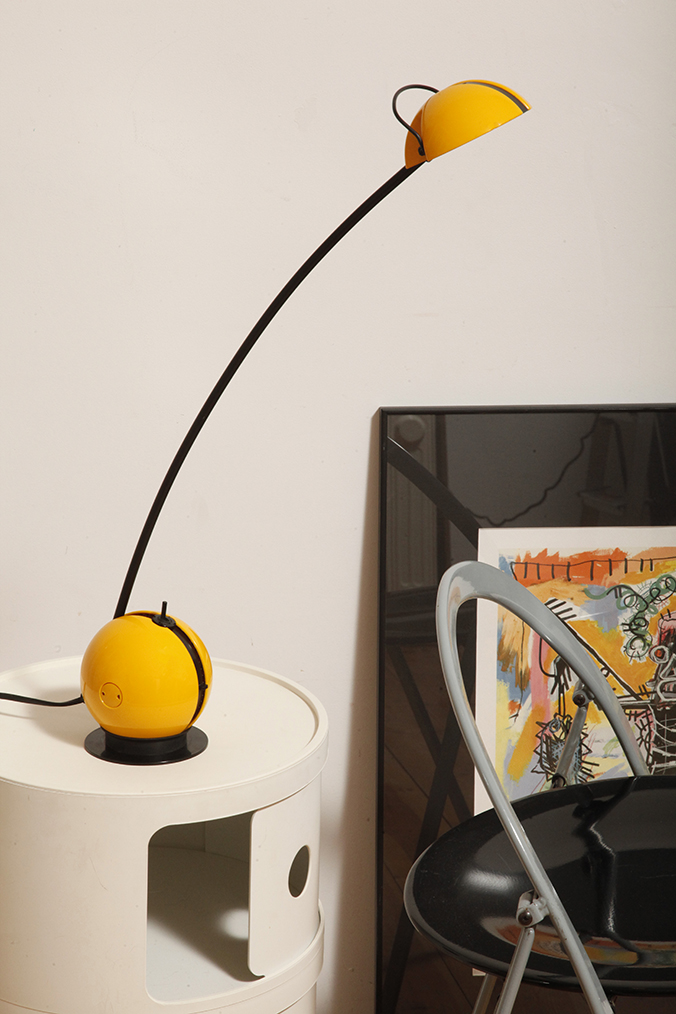 Cała żółta z czarnymi dodatkami, czyli bardzo klasycznie, choć lampa w ogóle klasyczna nie jest. Jak całe lata 80.