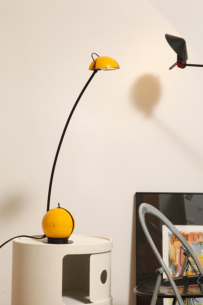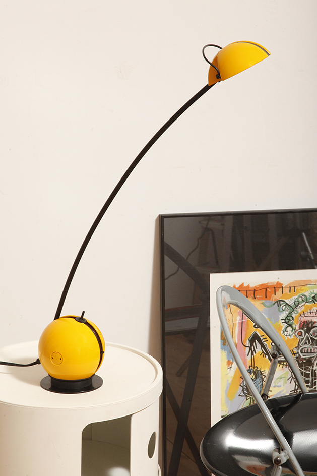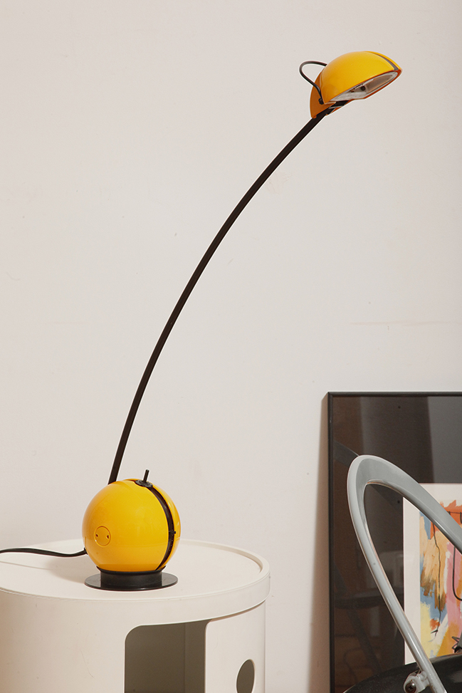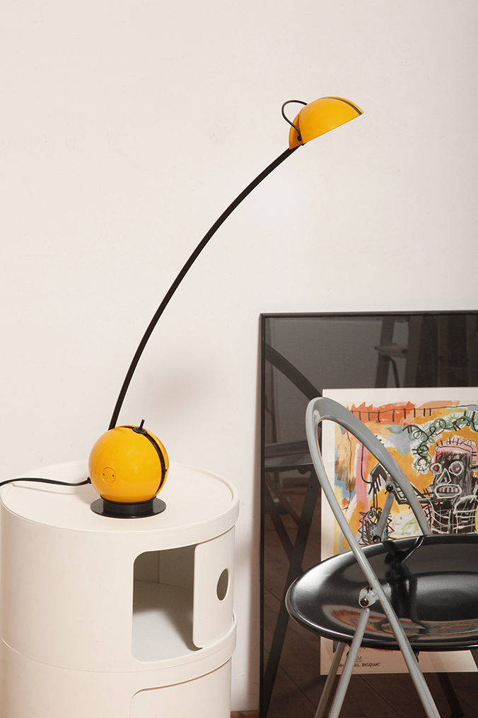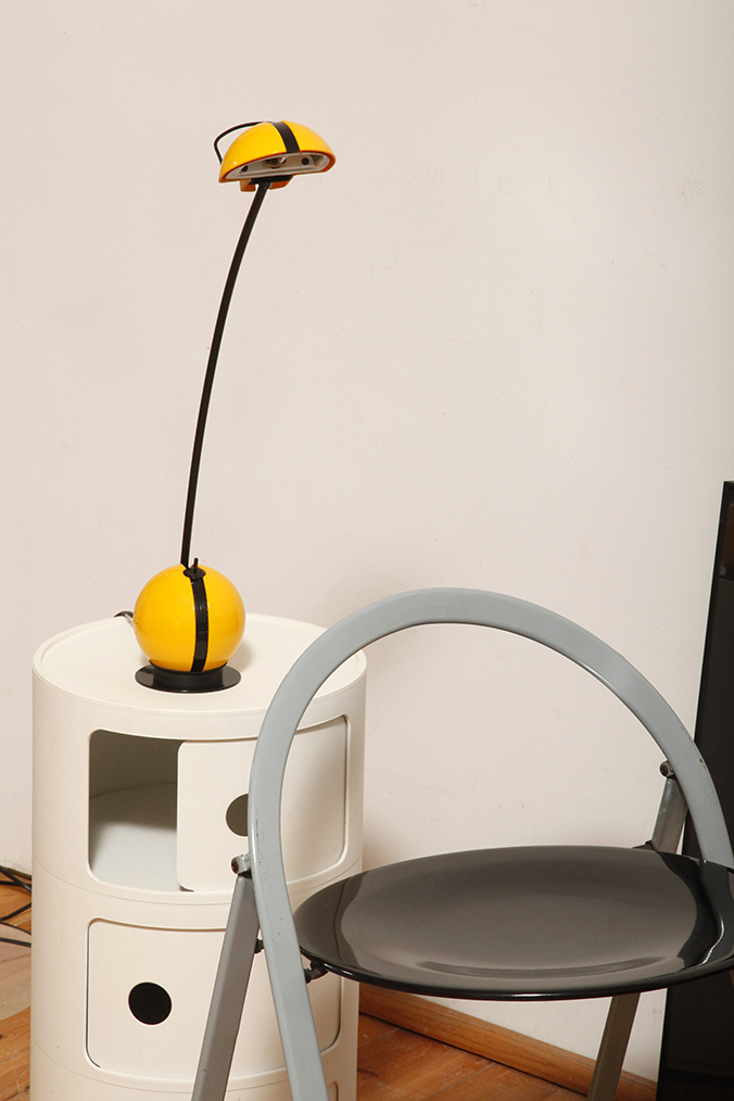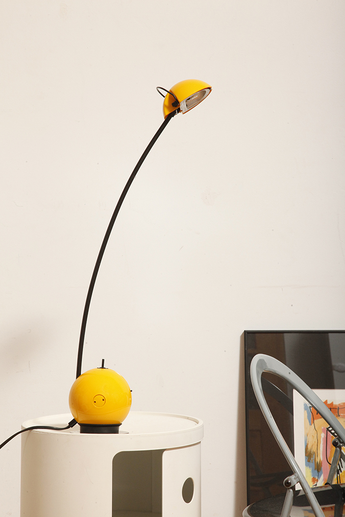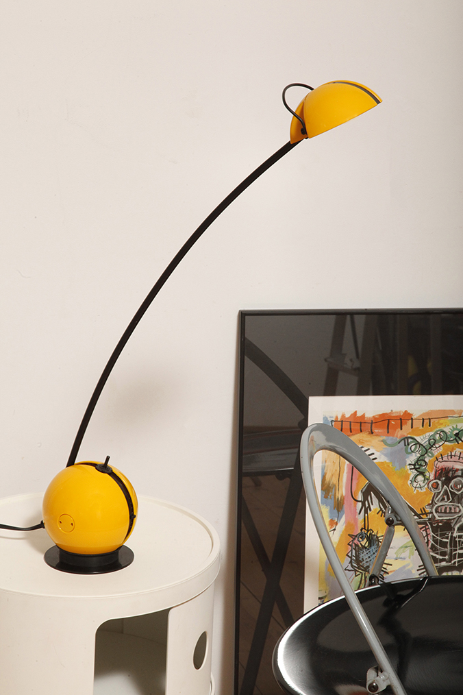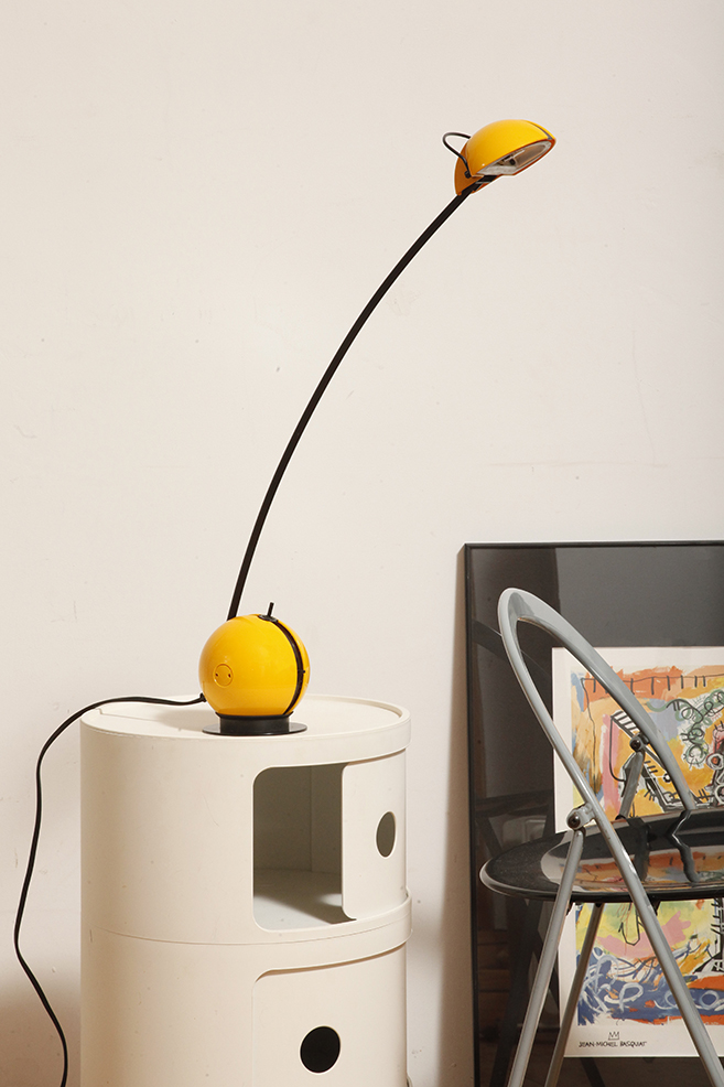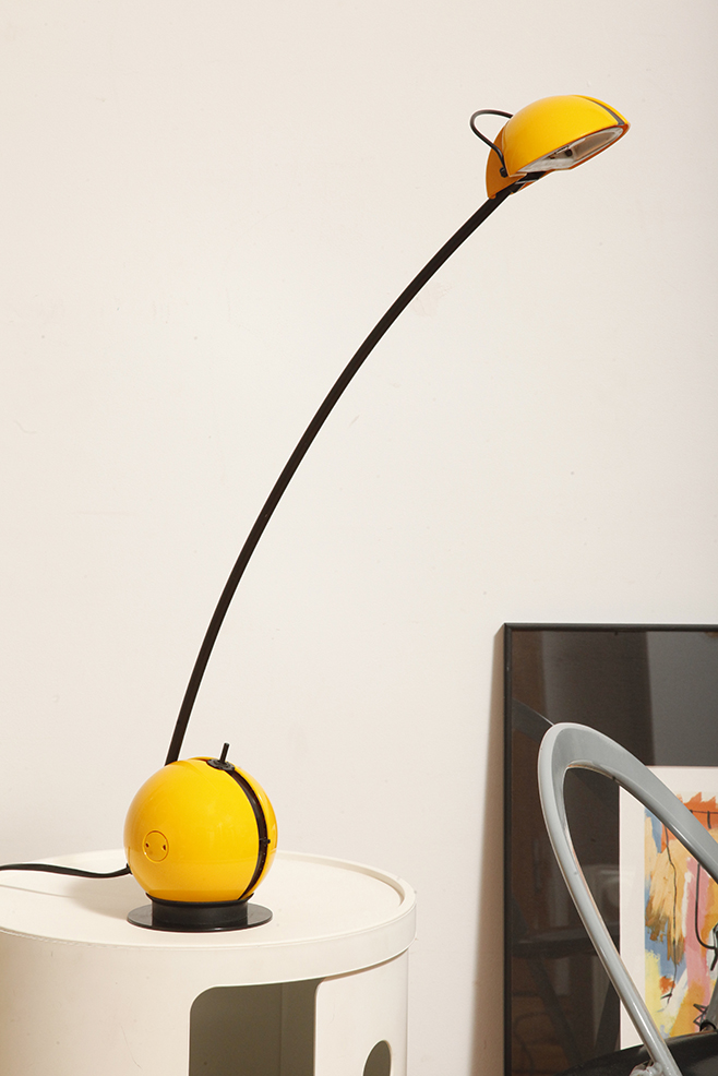 Cała żółta z czarnymi dodatkami, czyli bardzo klasycznie, choć lampa w ogóle klasyczna nie jest. Jak całe lata 80.