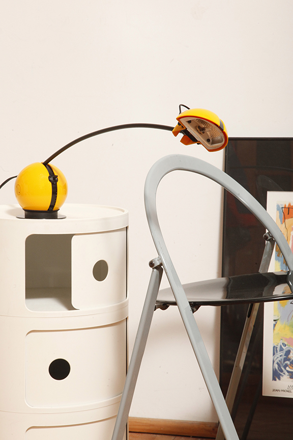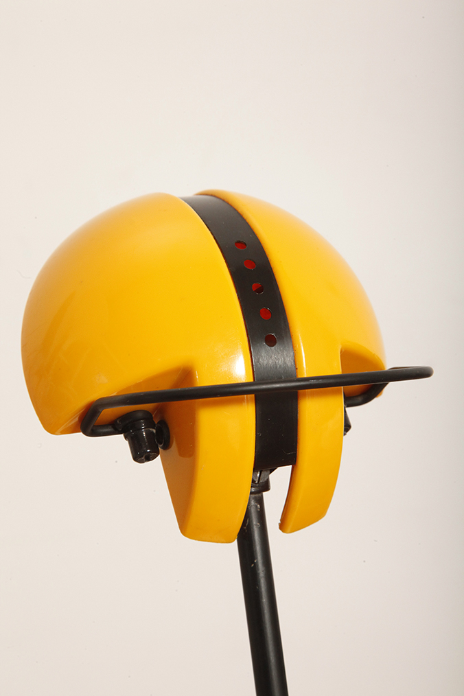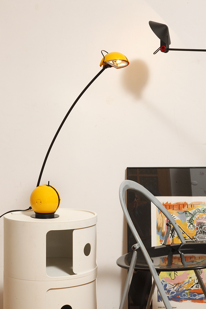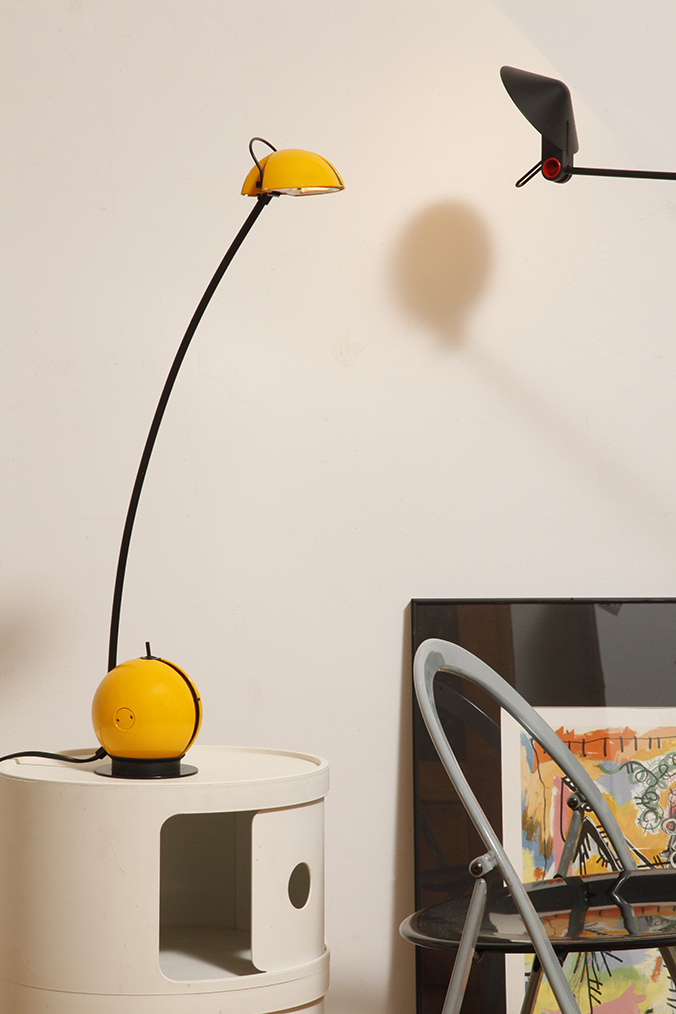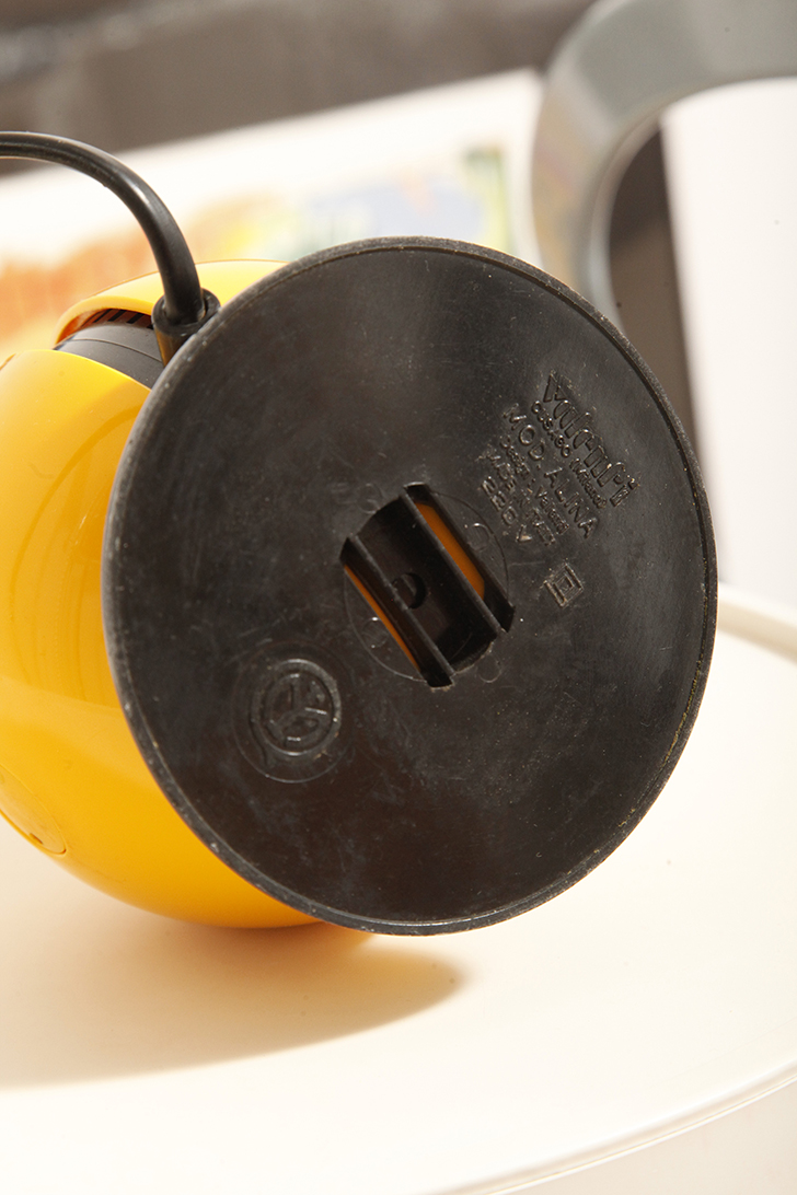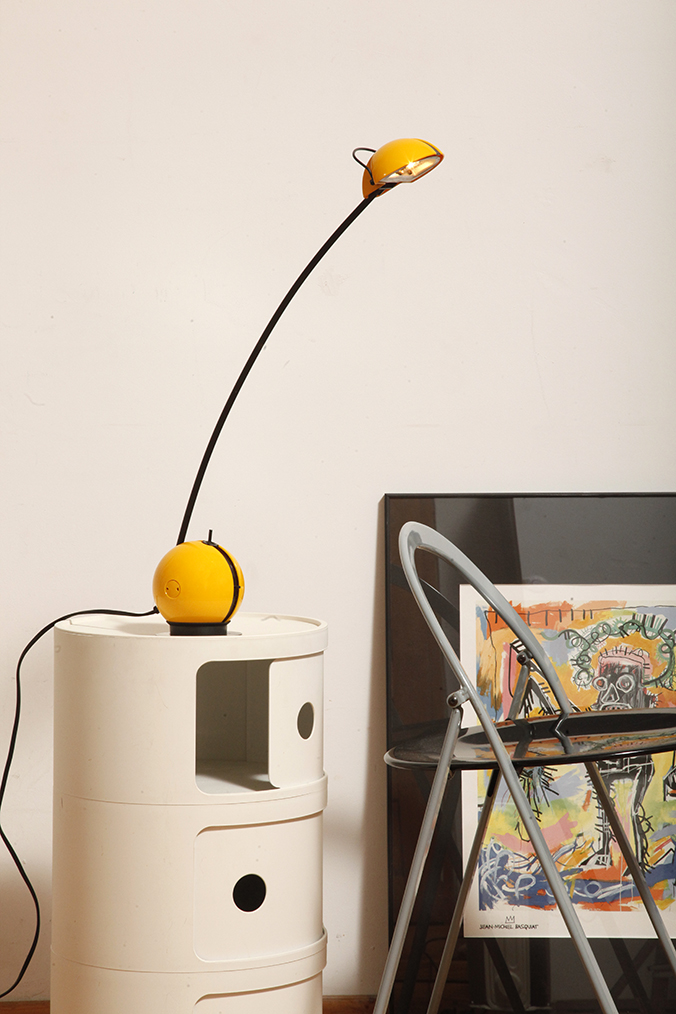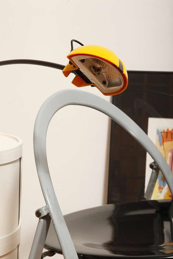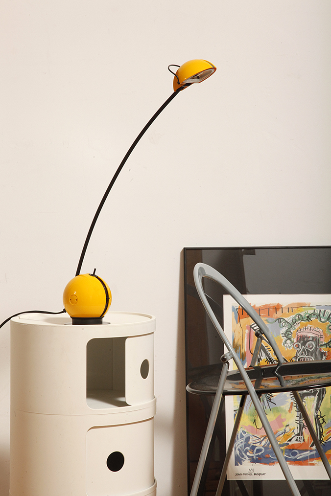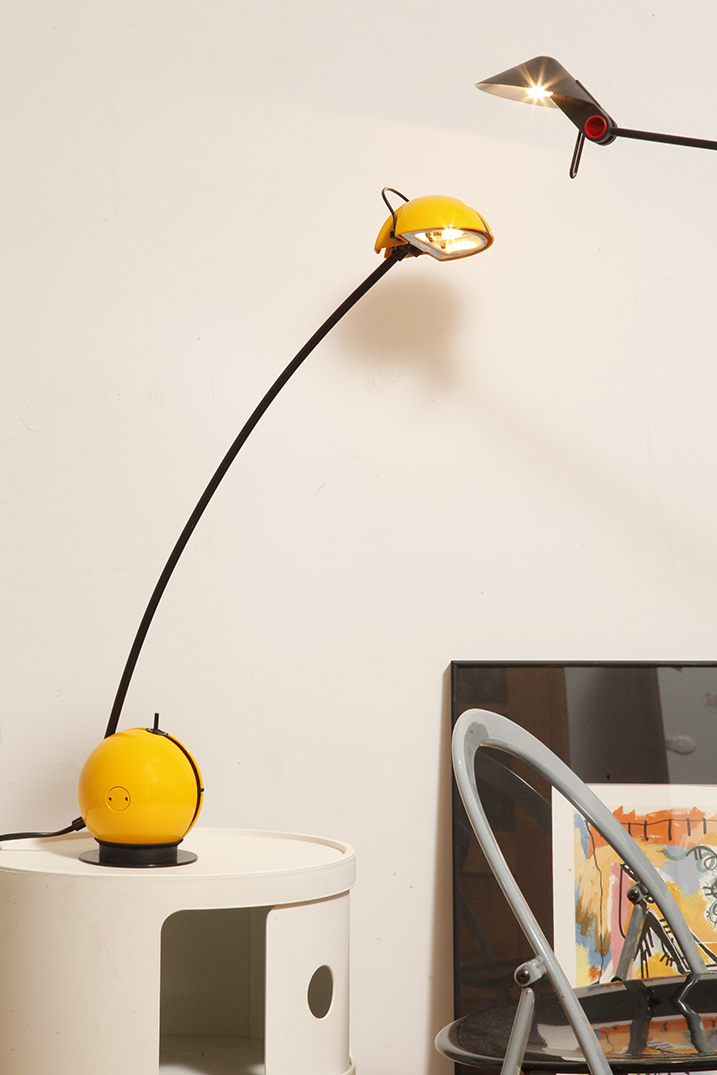Cała żółta z czarnymi dodatkami, czyli bardzo klasycznie, choć lampa w ogóle klasyczna nie jest. Jak całe lata 80.