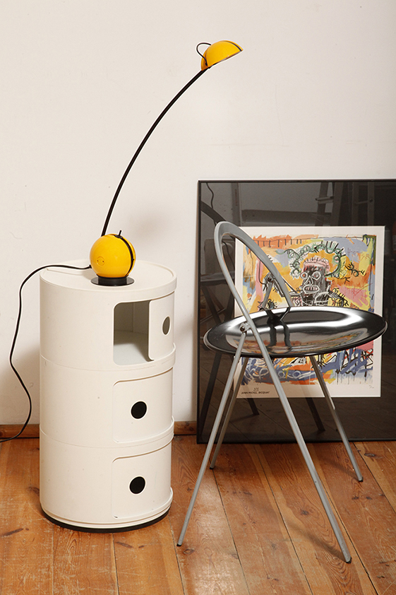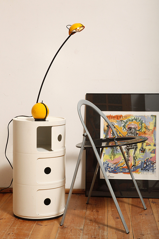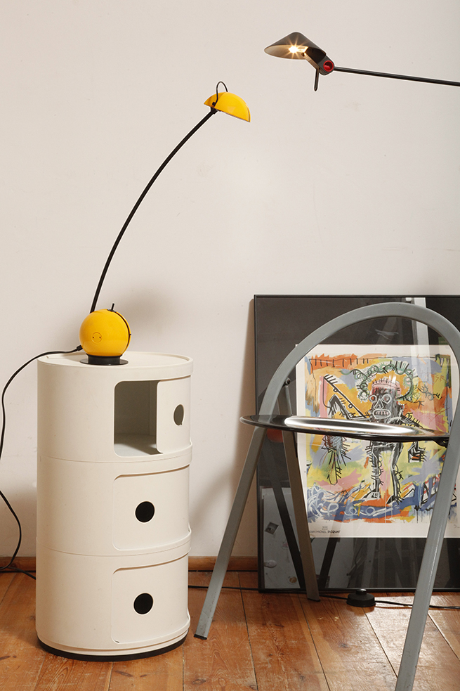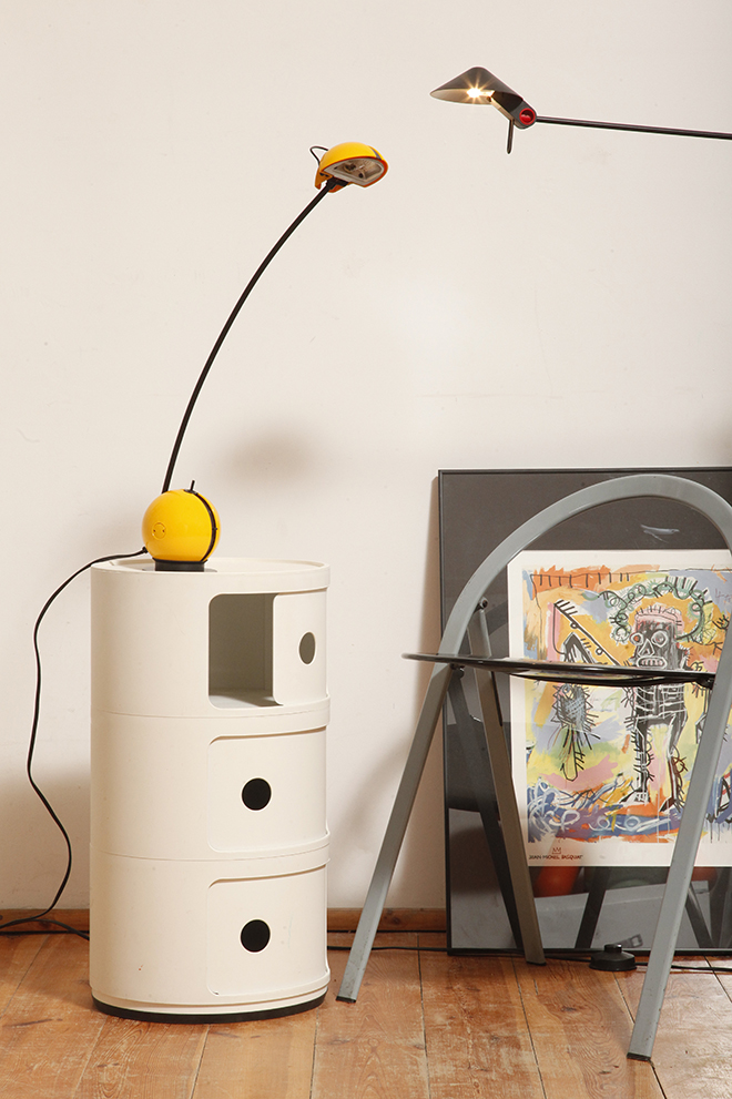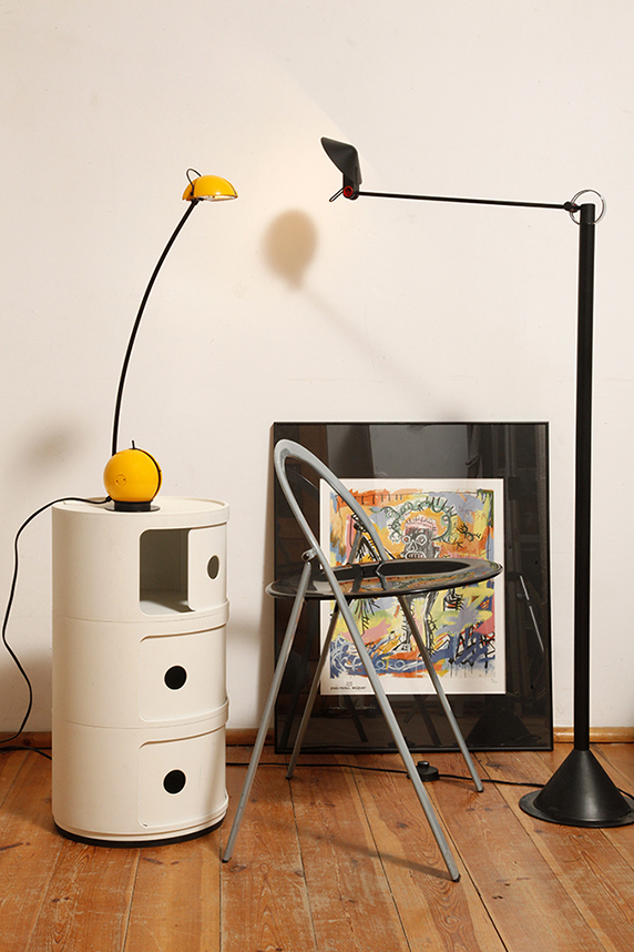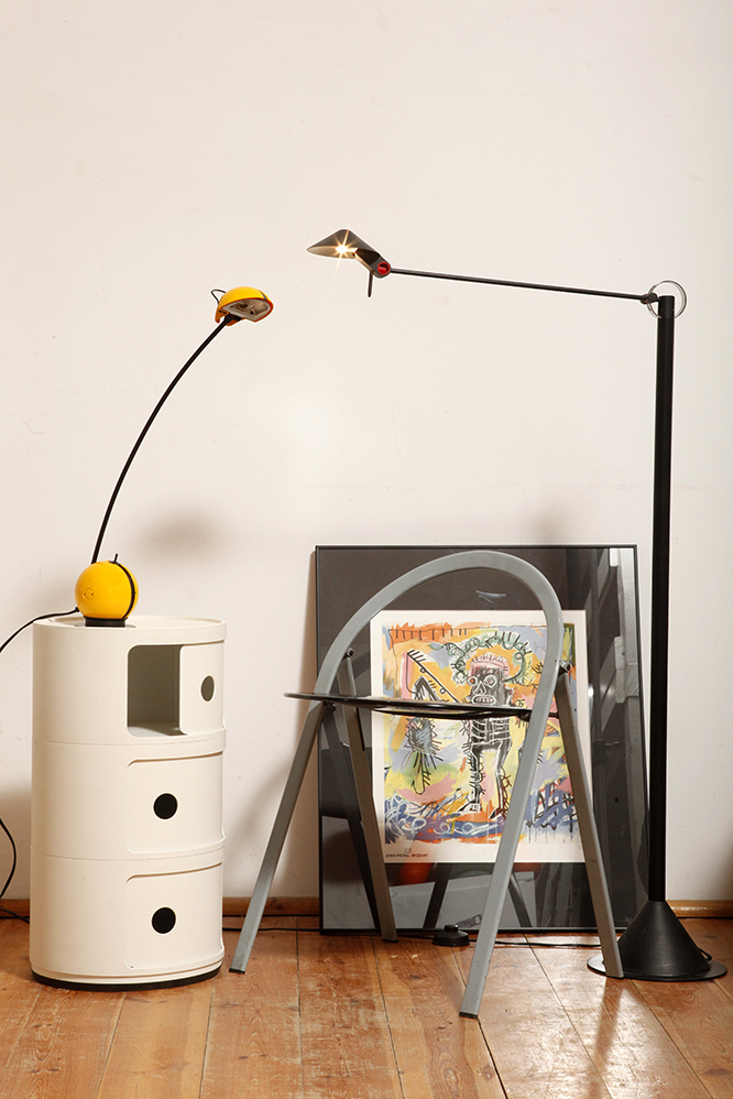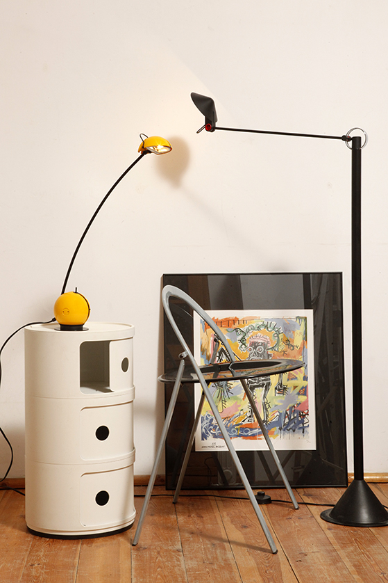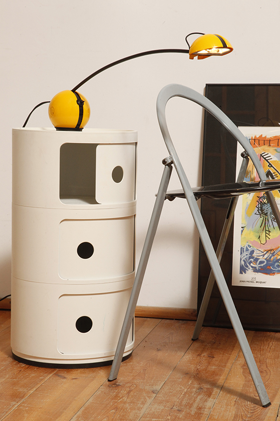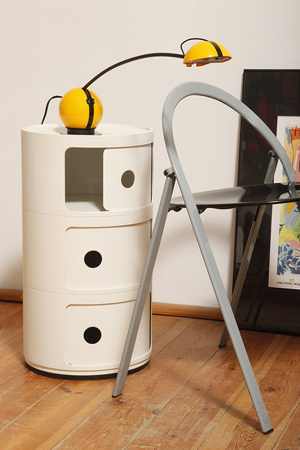 Cała biała z czarnymi dodatkami, czyli bardzo klasycznie, choć lampa w ogóle klasyczna nie jest. Jak całe lata 80.