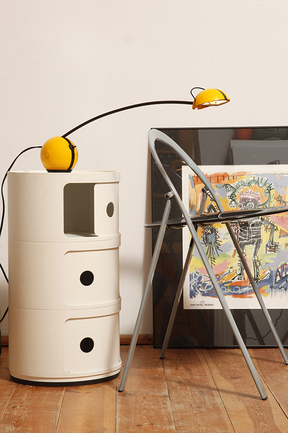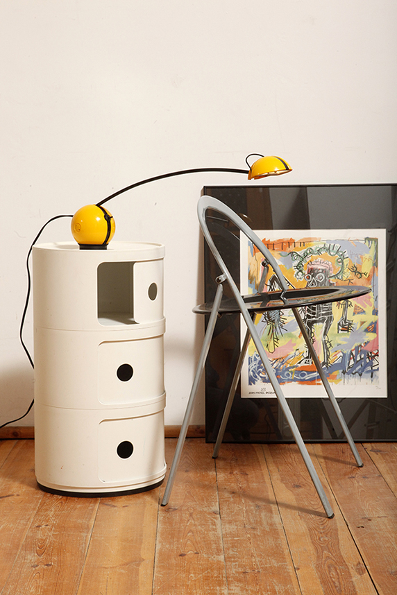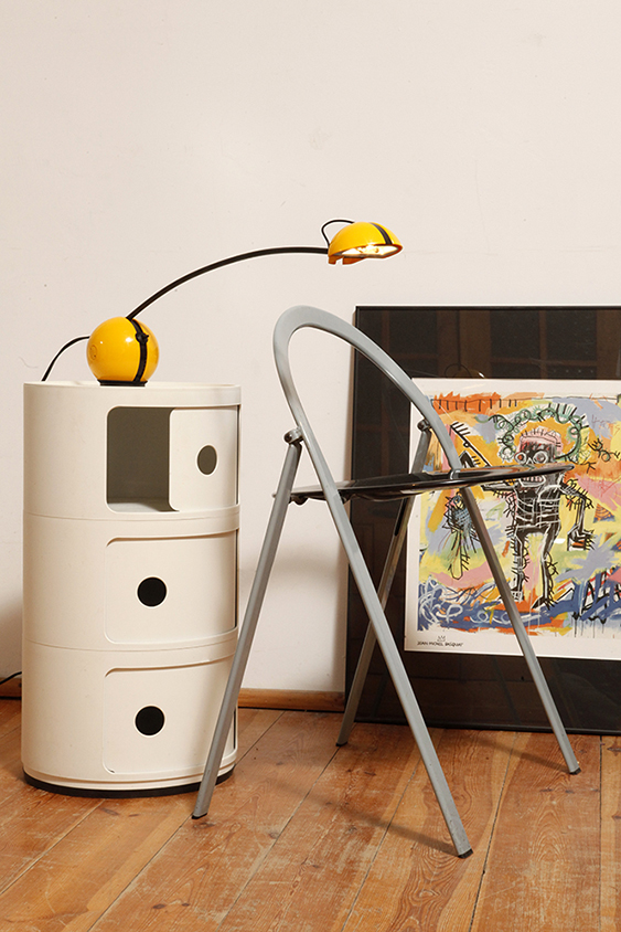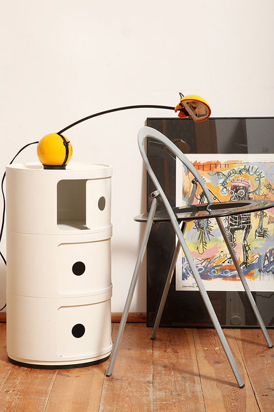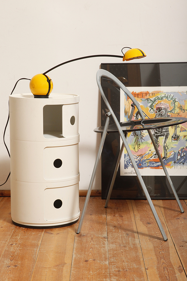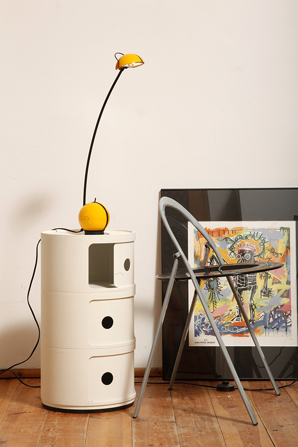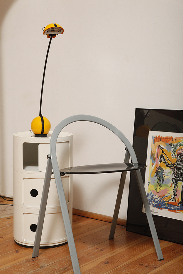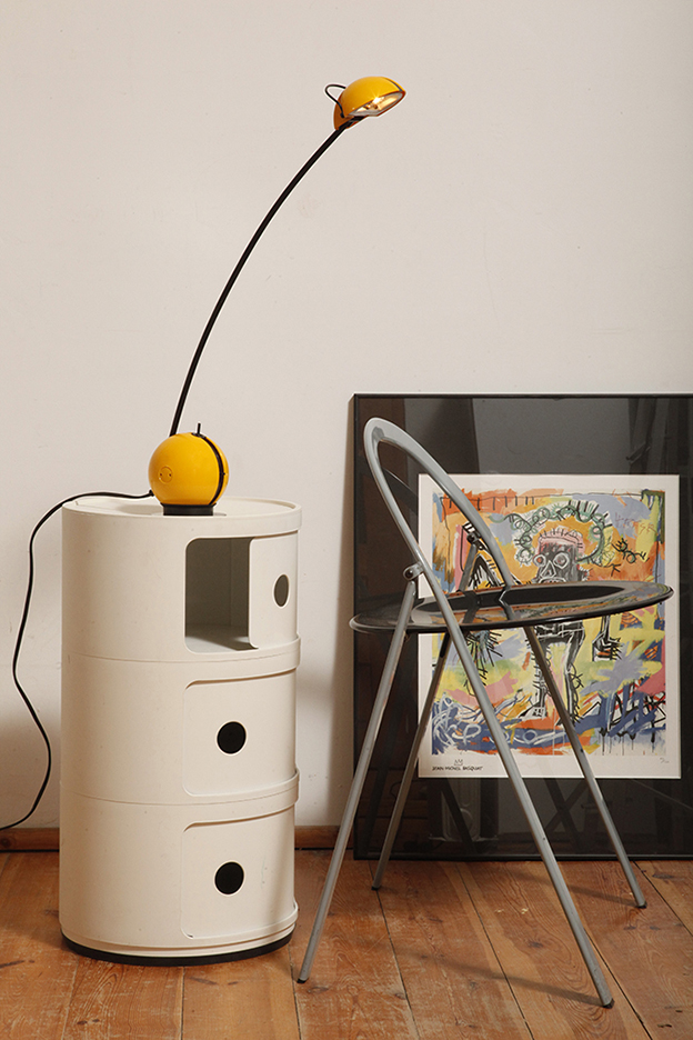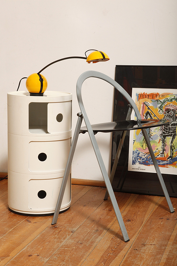 Cała biała z czarnymi dodatkami, czyli bardzo klasycznie, choć lampa w ogóle klasyczna nie jest. Jak całe lata 80.