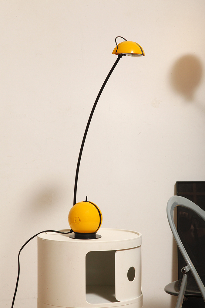 Wysoka jednopunktowa żółta lampa nocna/biurkowa „Alina” z tworzywa (ABS) z regulowaną wysokością nachylenia z czarną podstawą i ruchomym kloszem, Valenti Luce, Włochy, lata 70/80.