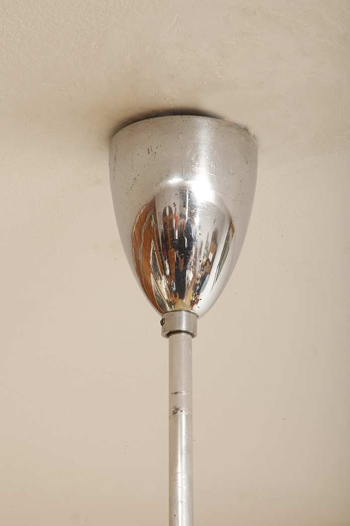 Metalowa sztyca i podsufitka z drobnymi oznakami wieku, oczyszczone, wymienione okablowanie. Lampa bezpieczna i gotowa do użytku.
