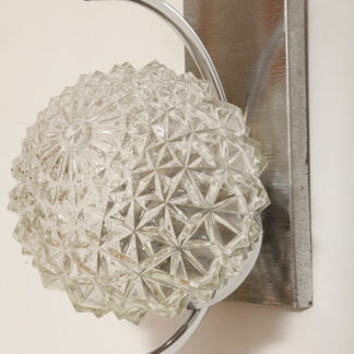 Jednopunktowy kinkiet z fakturowym szklanym kloszem w kształcie kuli i tylną metalową błyszczącą ścianką z okrągłą chromowaną obejmą No 1, Włochy, lata 60/70