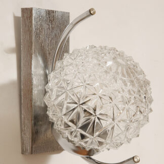 Jednopunktowy kinkiet z fakturowym szklanym kloszem w kształcie kuli i tylną metalową błyszczącą ścianką z okrągłą chromowaną obejmą No 2, Włochy, lata 60/70