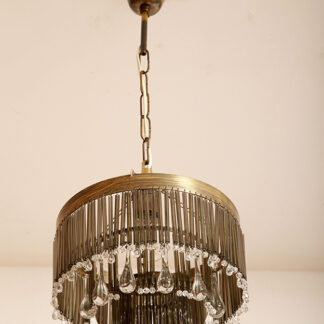 • Kaskadowa trzypoziomowa jednopunktowa lampa sufitowa w stylu boho złożona z przeźroczystych szklanych wisiorków i czarnych szklanych pałeczek wiszących na trzech metalowych obręczach w kolorze starego złota, Typ 18-01, Železnobrodskié Sklo, Czechosłowacja, lata 50. Kaskadowa trzypoziomowa jednopunktowa lampa sufitowa w stylu boho złożona z przeźroczystych szklanych wisiorków i czarnych szklanych pałeczek wiszących na trzech metalowych obręczach w kolorze starego złota, Typ 18-01, Železnobrodskié Sklo, Czechosłowacja, lata 50. 1.520,00 zł