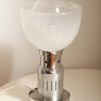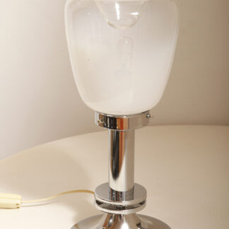 Jednopunktowa lampa biurkowa/nocna/stołowa ze szklanym mleczno białym półprzezroczystym kloszem i metalową polerowaną podstawą, Włochy, lata 70.