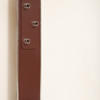 Wolnostojący podłogowy wieszak/garderoba na ubrania złożony z prostokątnego panelu otoczonego metalową chromowaną rurą obitego brązowym skajem z trzema masywnymi okrągłymi zawieszkami z tworzywa, Space Age, Włochy, lata 60/70
